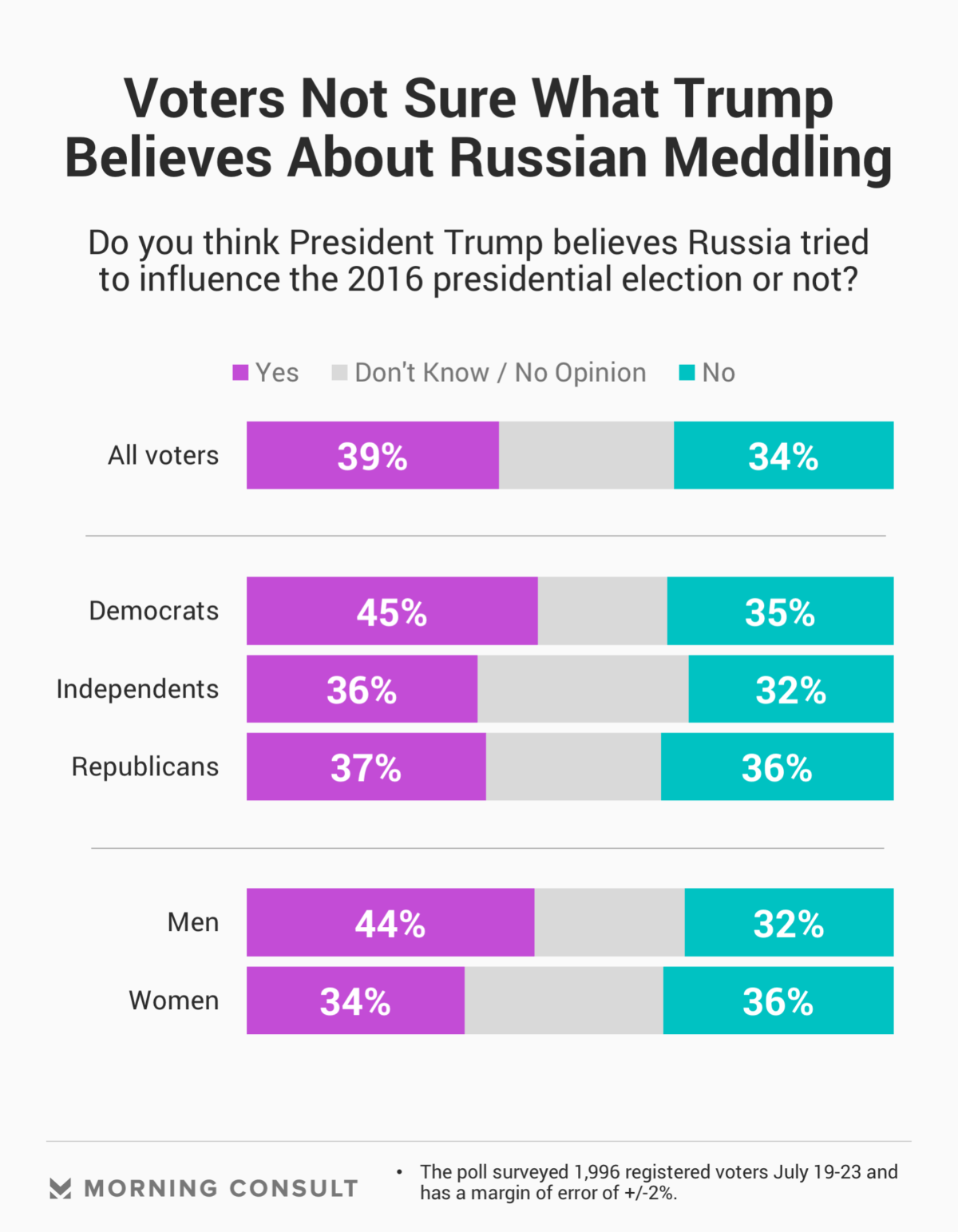 Voters were split on what Trump actually believes about Russian interference: A small plurality (39 percent) said he does believe Russia tried to meddle in the 2016 race, while 34 percent said he doesn’t. Republicans were split – 37 percent to 36 percent – on the question, while a plurality of Democrats said Trump does believe Russia tried to influence the contest.