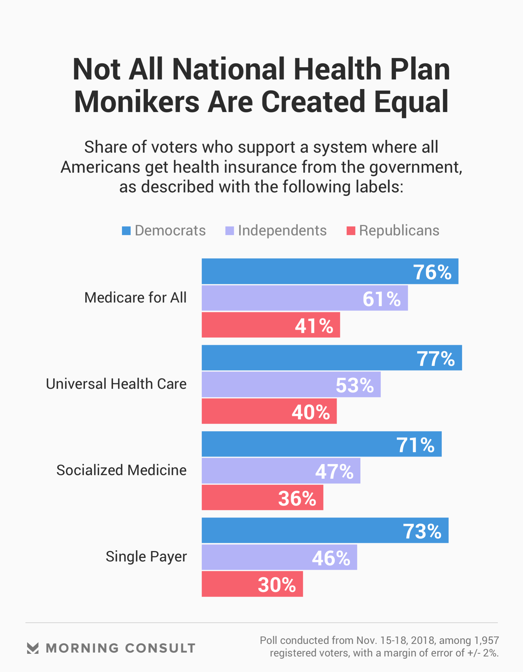 As they deliberate messaging tactics, a new Morning Consult/Politico survey suggests that while describing the controversial health policy as “Medicare for all” is a crowd pleaser, Democrats should avoid calling it a “single-payer” plan.