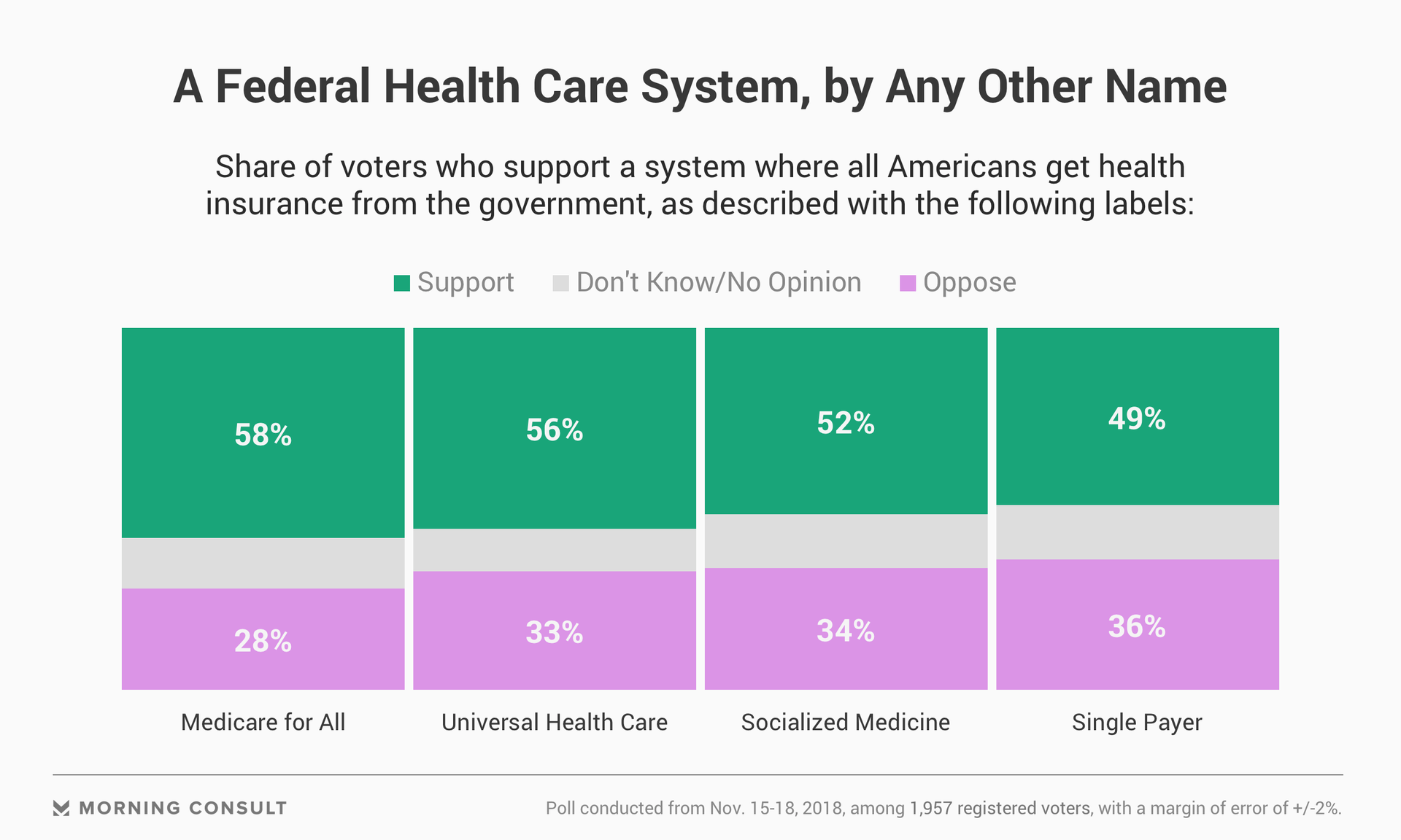 By contrast, “single payer” has the lowest odds of captivating voters, with 49 percent saying they support a health care system under that title. “Universal health care” and “socialized medicine” are supported by 56 percent and 52 percent of respondents, respectively. The Nov. 15-18 poll has a margin of error of 2 percentage points.
