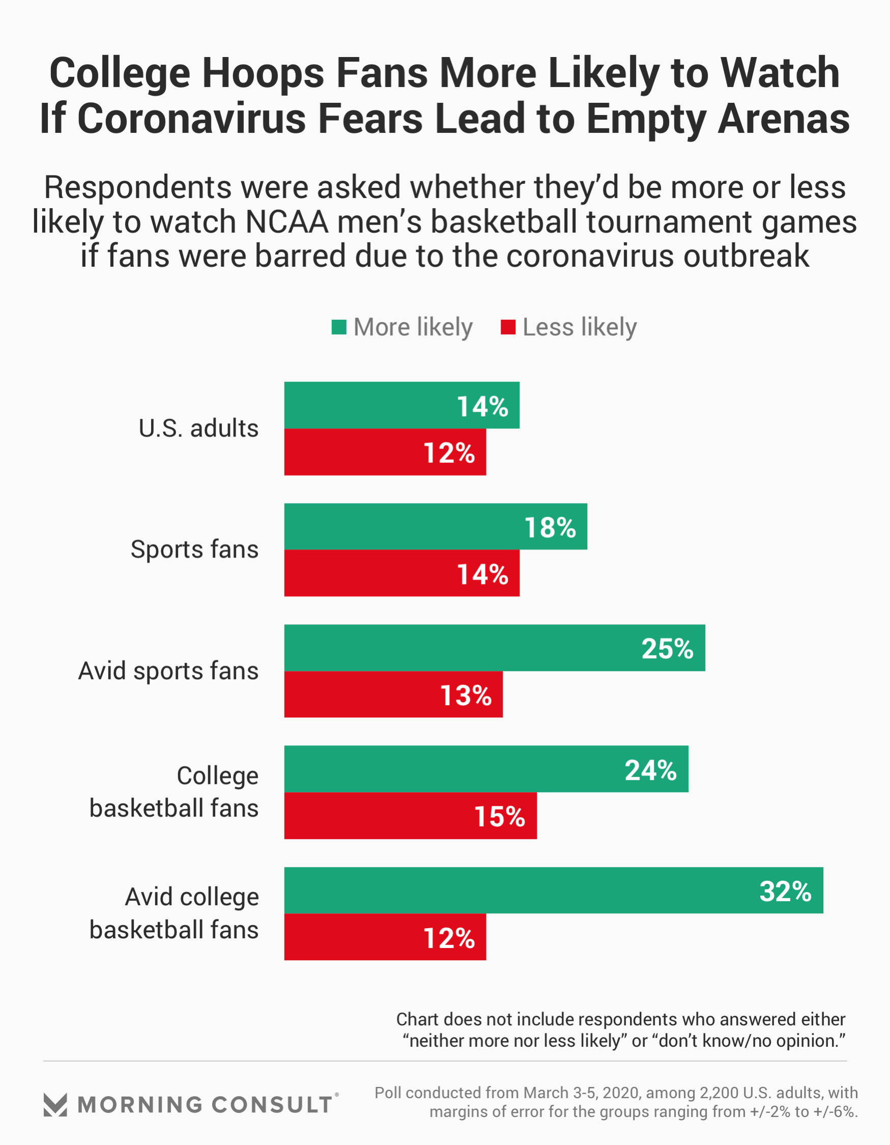 A March 3-5 Morning Consult survey found that the lion’s share of U.S. adults are about as likely to watch games with fans in the stands as games played in empty arenas. And for avid sports fans and college basketball enthusiasts, the novelty of games without crowds on site could actually increase interest.