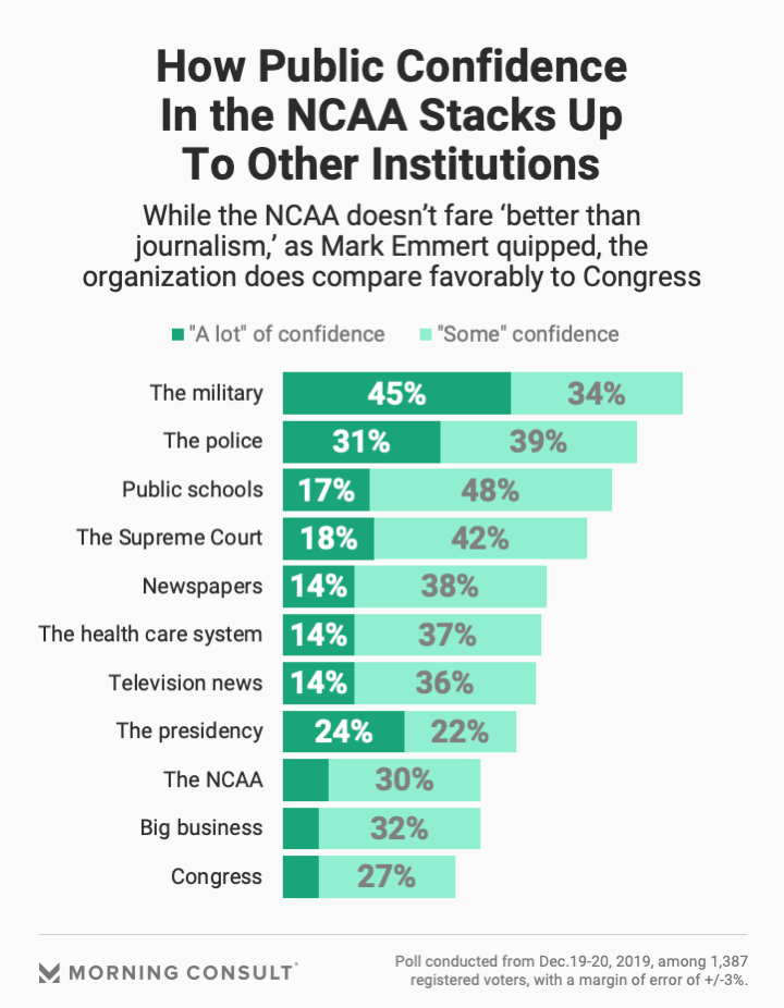 The public does, however, have more faith in the NCAA than in Congress, which earned “a lot” of confidence from 7 percent of voters and “some” confidence from 27 percent. Ironically, Congress might be the only institution that can help Emmert and the NCAA maintain a nationwide standard of governance over college athletics amid an onslaught of disparate regulations pending in state legislatures concerning compensation for the use of student-athletes’ name, image or likeness.