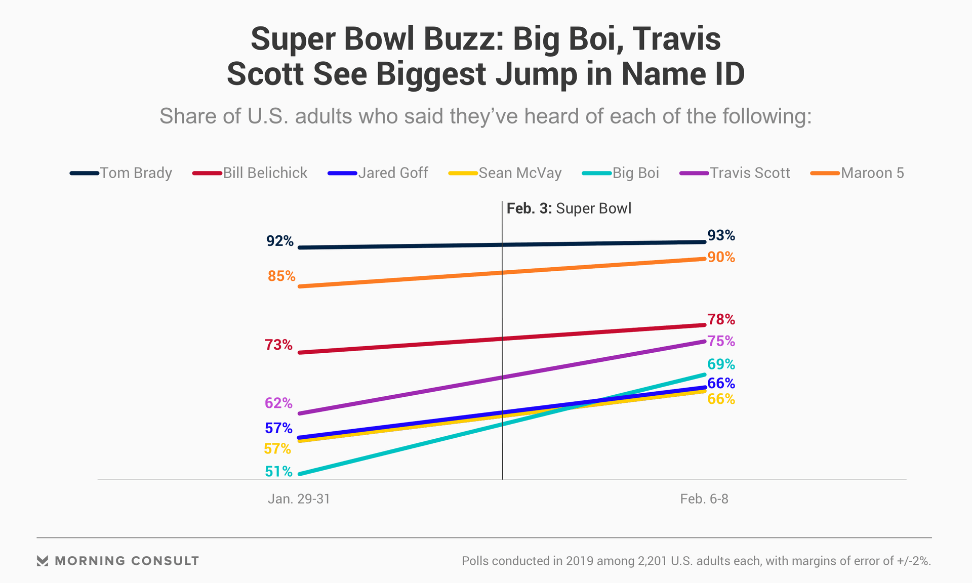 Across two separate Morning Consult surveys conducted Jan. 29-31 and Feb. 6-8, rappers Big Boi and Travis Scott saw their name recognition rise by 18 points and 13 points, respectively. Each of the surveys, which had a 2-point margin of error, were conducted among 2,201 U.S. adults. Maroon 5, the pop rock band featuring Adam Levine that was already known by most people, scored a 5-point uptick.