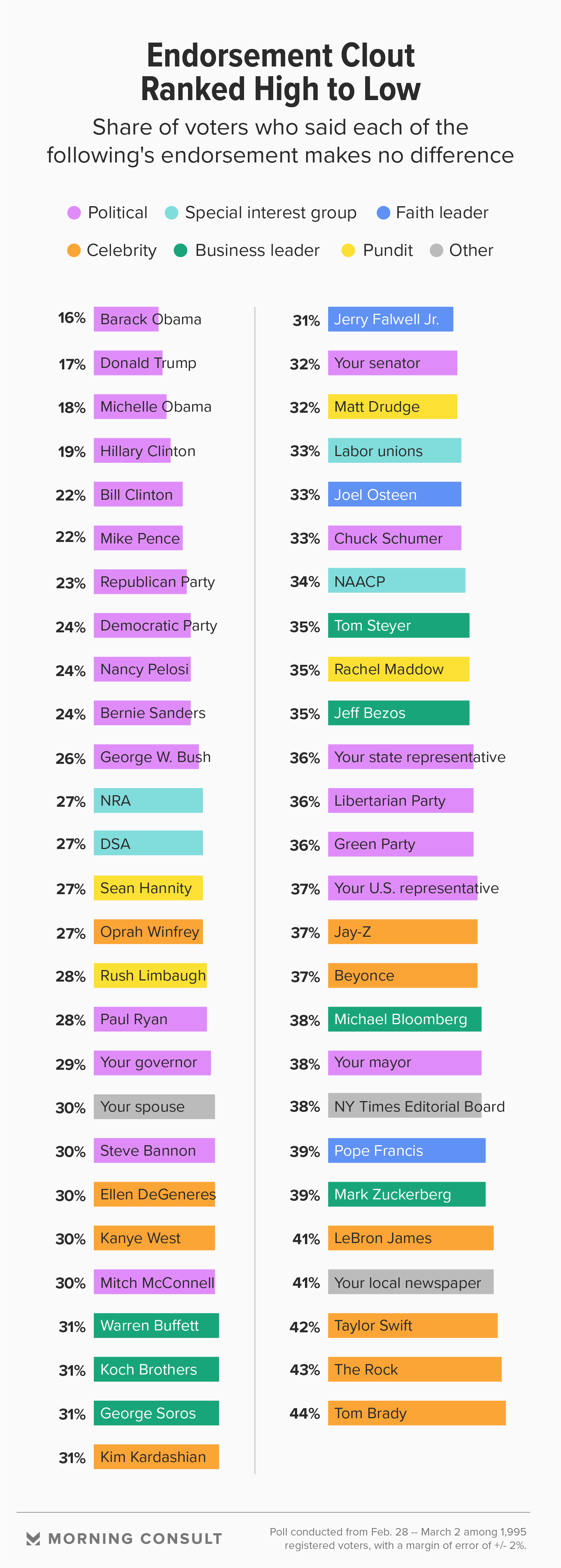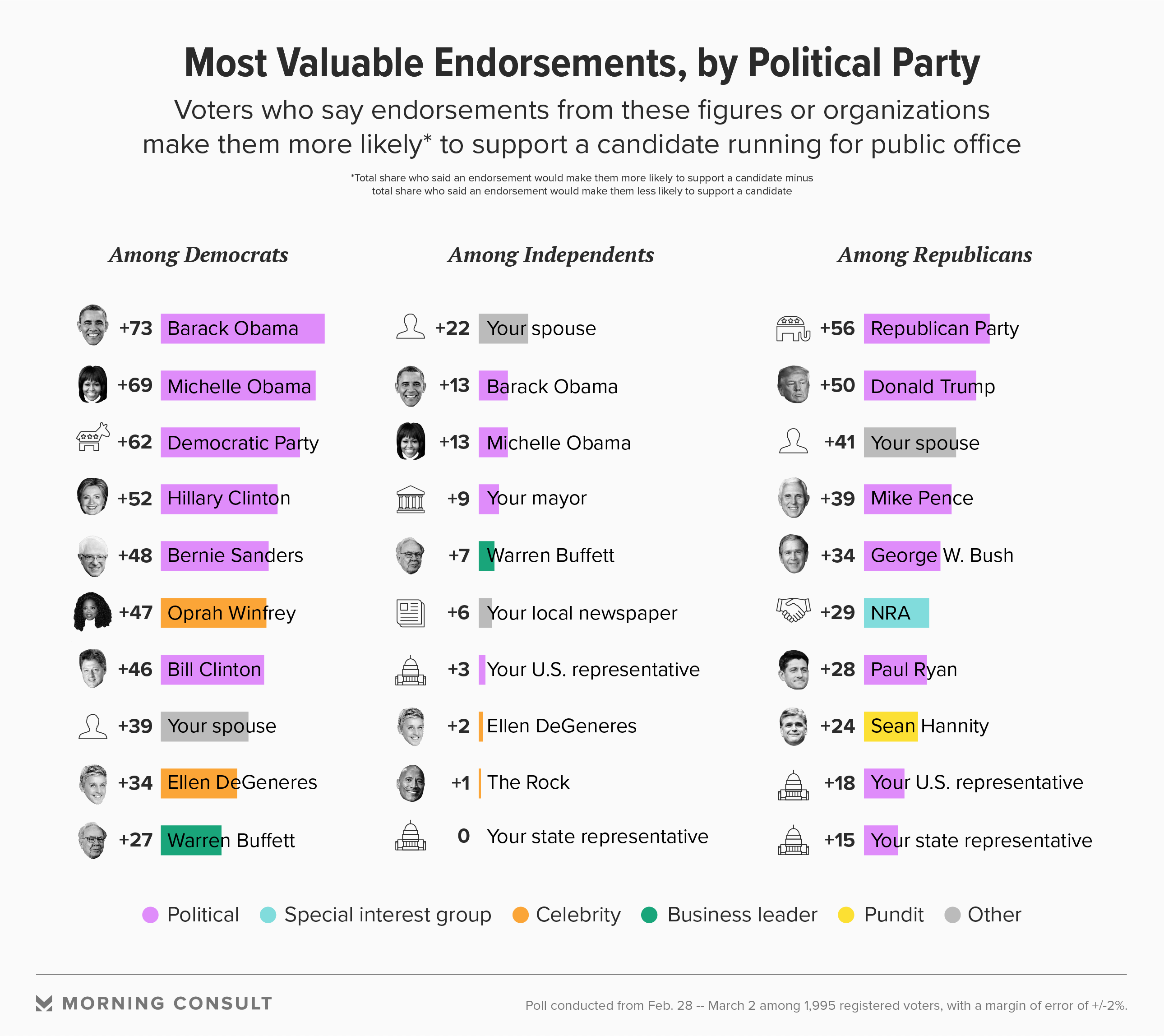 That’s a key takeaway from a new Morning Consult survey -- conducted Feb. 28 through March 2 among a sample of 1,995 registered voters -- testing the influence of endorsements from a number of political players, special interest groups, faith and business leaders, pundits and celebrities.