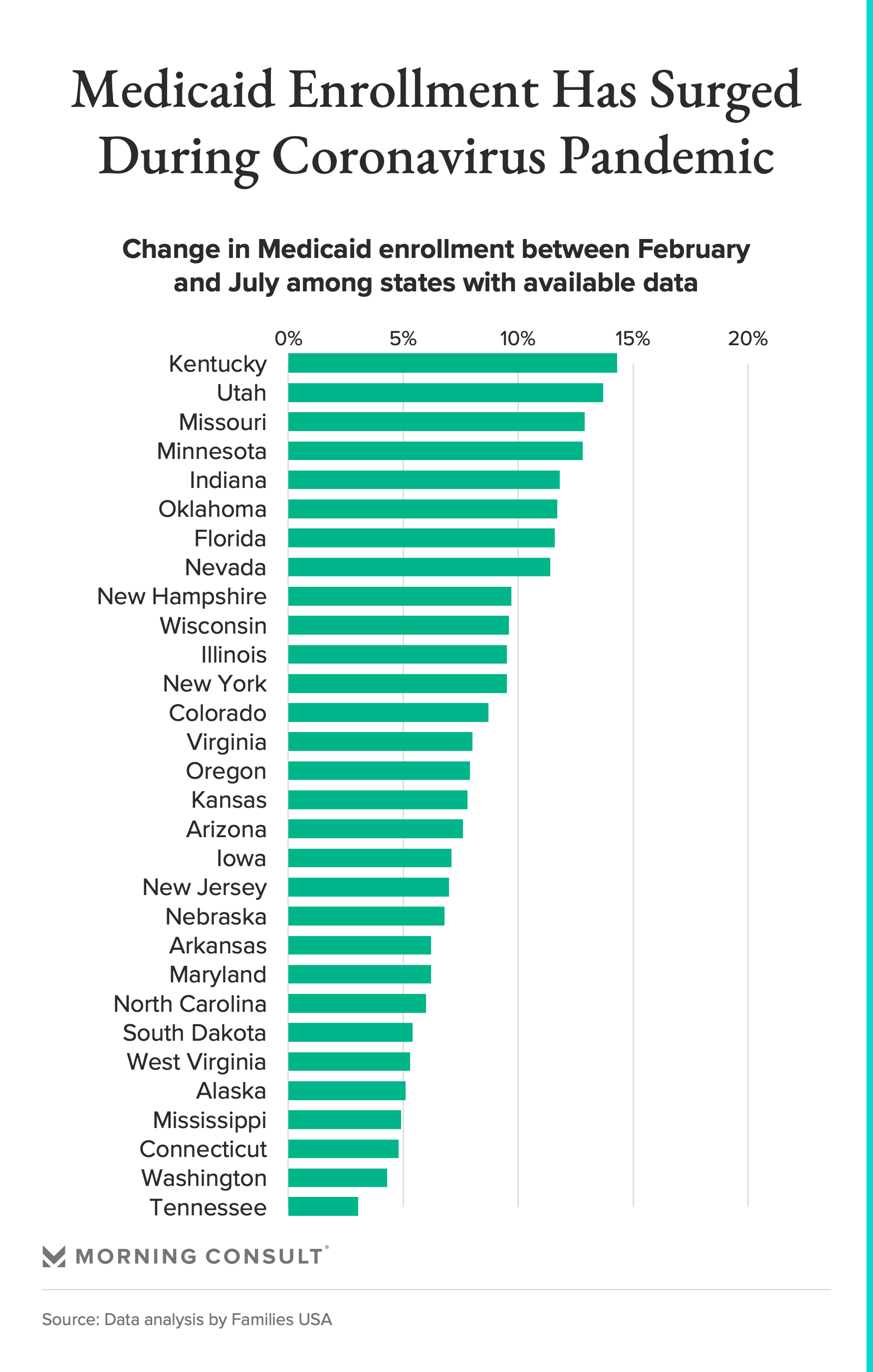 For example, facing a $1.2 billion deficit, the Nevada Legislature reduced Medicaid provider rates by 6 percent this summer, while Colorado implemented a 1 percent cut to Medicaid community providers, increased co-pays for some Medicaid-covered services and delayed a new benefit for people with substance use disorder. The cuts come as the need for health care services has surged: Families USA estimates that more than 4.3 million people have been added to the Medicaid rolls since February, with state-level increases ranging from 0.8 percent in Montana to 17.2 percent in Kentucky.