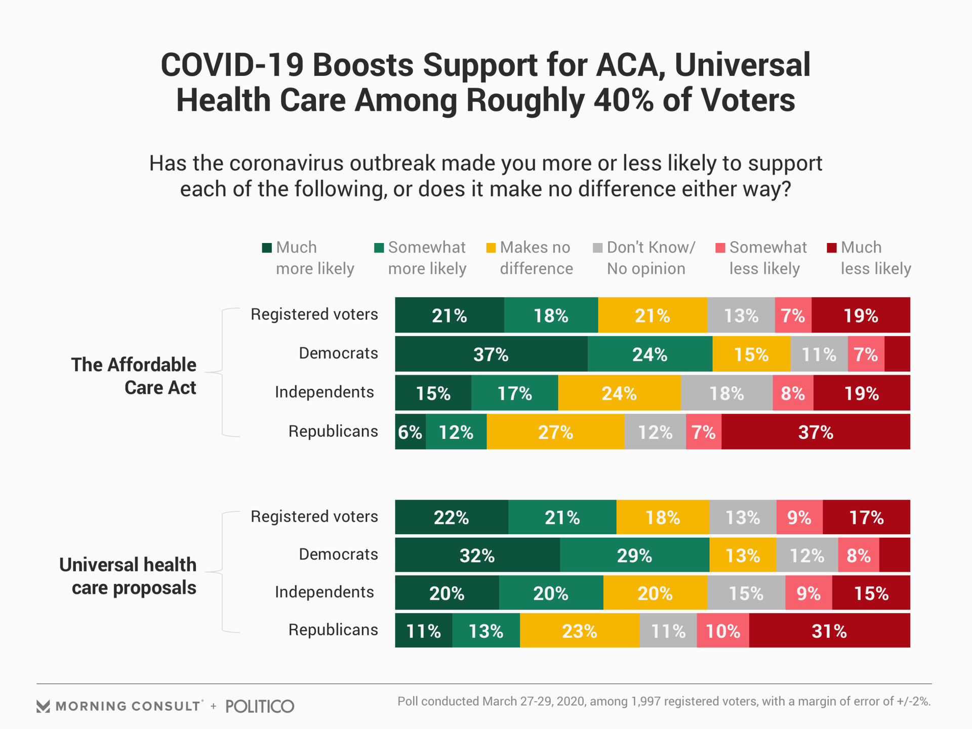 The poll also found COVID-19 has caused 39 percent of voters to say they are more likely to support the ACA, which enshrined protections for American workers that have been indispensable amid a public health crisis. However, even the pandemic has proven incapable of overcoming the fraught partisanship that has ensnared the health law since its inception: 44 percent of Republicans say the outbreak has made them less likely to support the ACA.