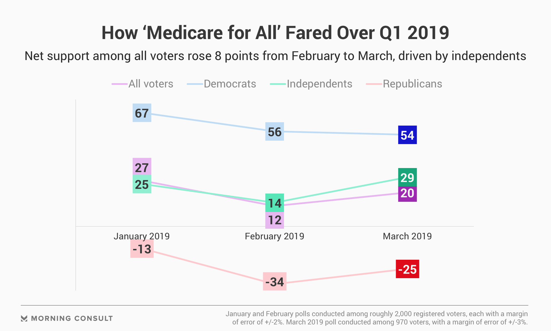 In addition, after taking a fall from January to February, net support among all voters for “Medicare for all” recovered some lost gains, jumping from 12 points in February to 20 in March. The 67 percent growth was fueled mostly by independents, whose net support more than doubled, from 14 to 29 points, and Republicans, whose net support -- though still deep underwater -- rose 9 points to minus 25.