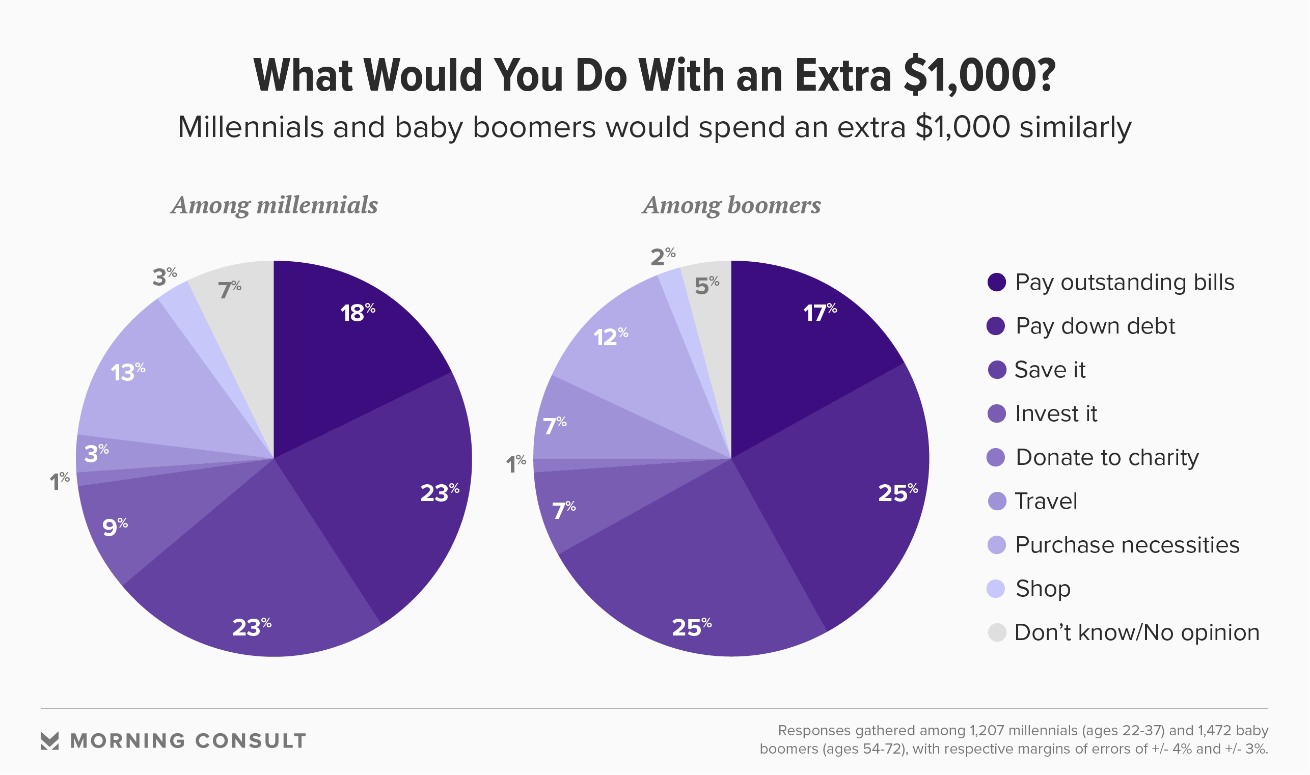 For example, when respondents were asked what they do with an extra $1,000 in a month, millennial priorities largely line up with their baby boomer counterparts.