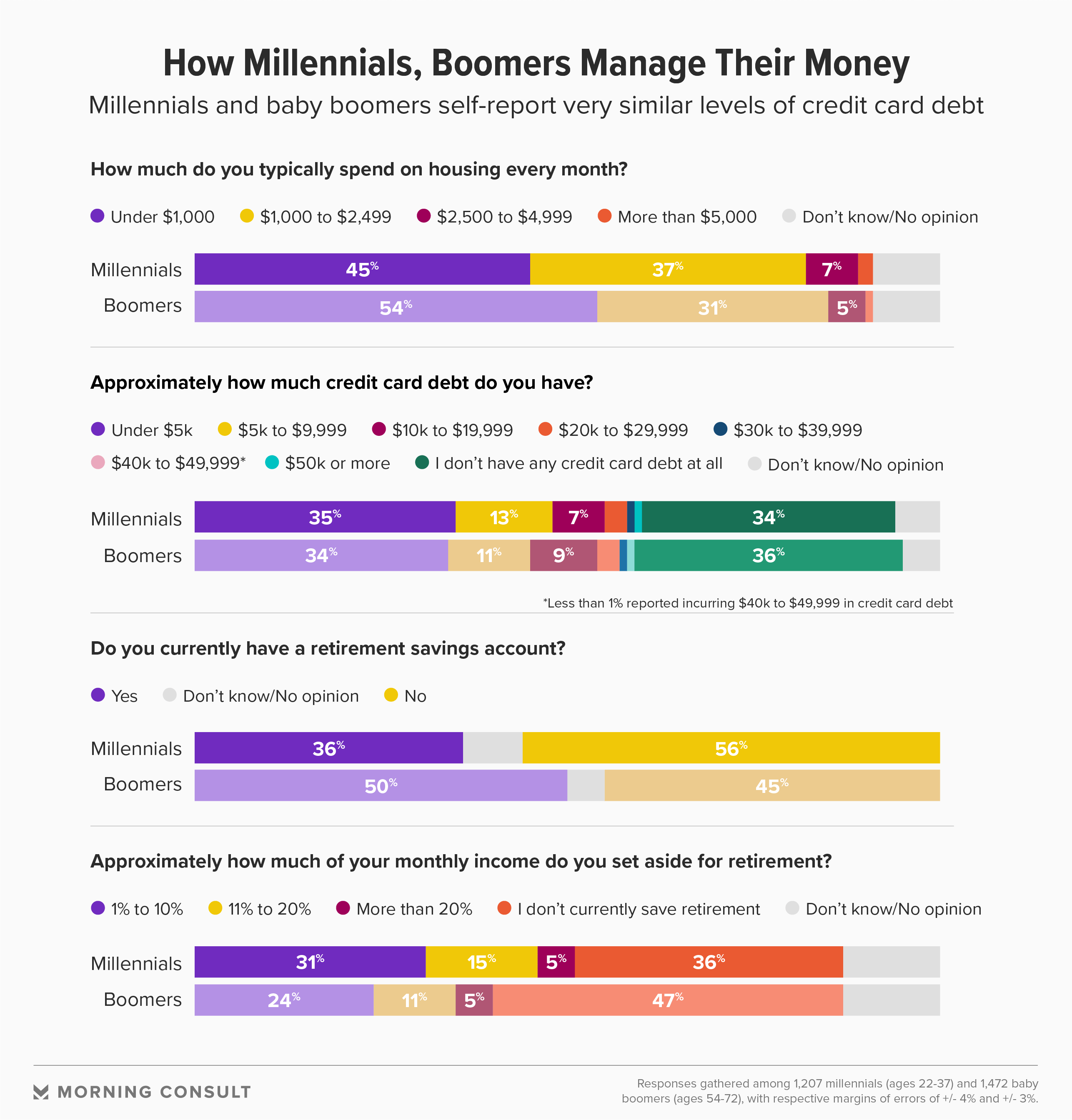 The two generations also report having relatively even amounts of credit card debt. Most millennials (35 percent) said they have under $5,000 in credit card debt compared to 34 percent of baby boomers.