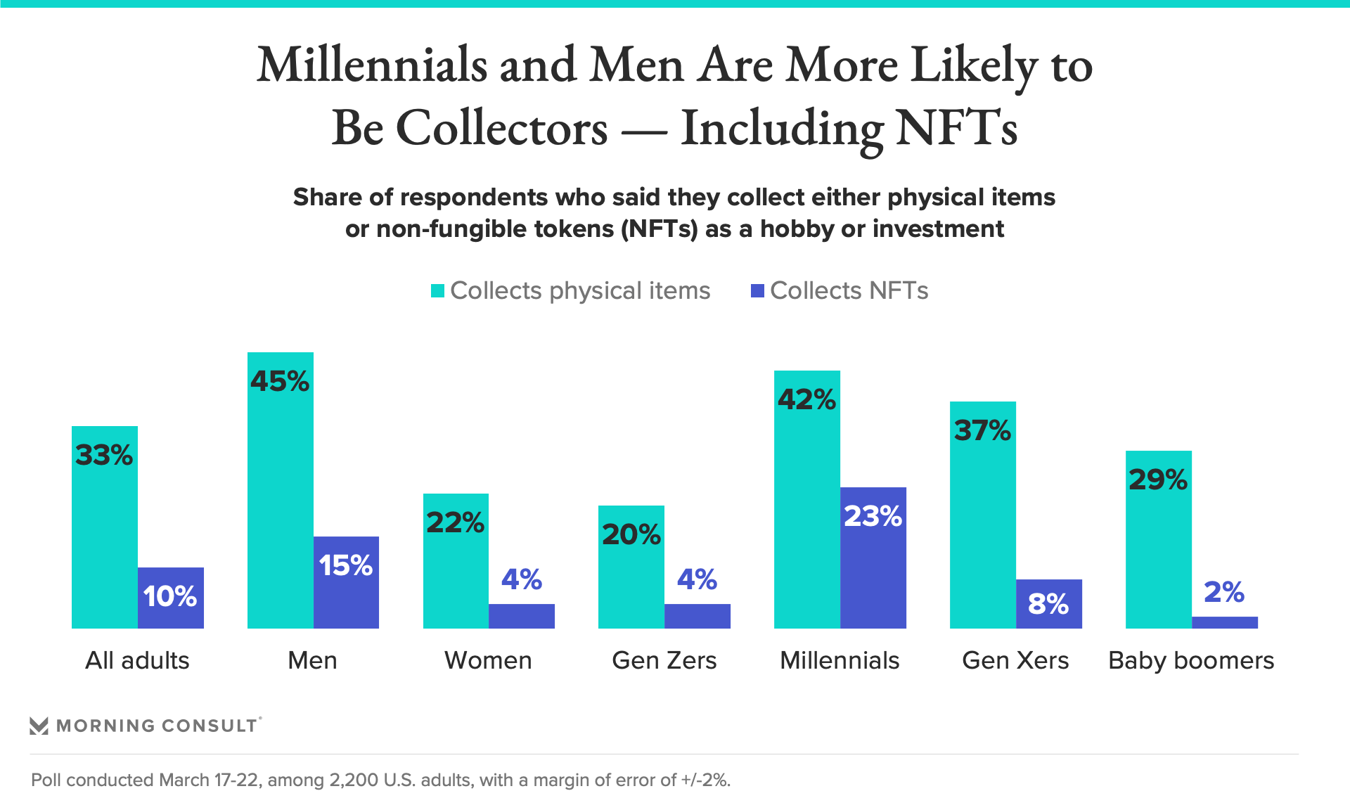 In a Morning Consult survey conducted March 17-22, 1 in 3 U.S. adults said they collect some sort of physical item as either a hobby or investment, with 10 percent of respondents identifying themselves as avid collectors. Another 20 percent of adults said they are former collectors.