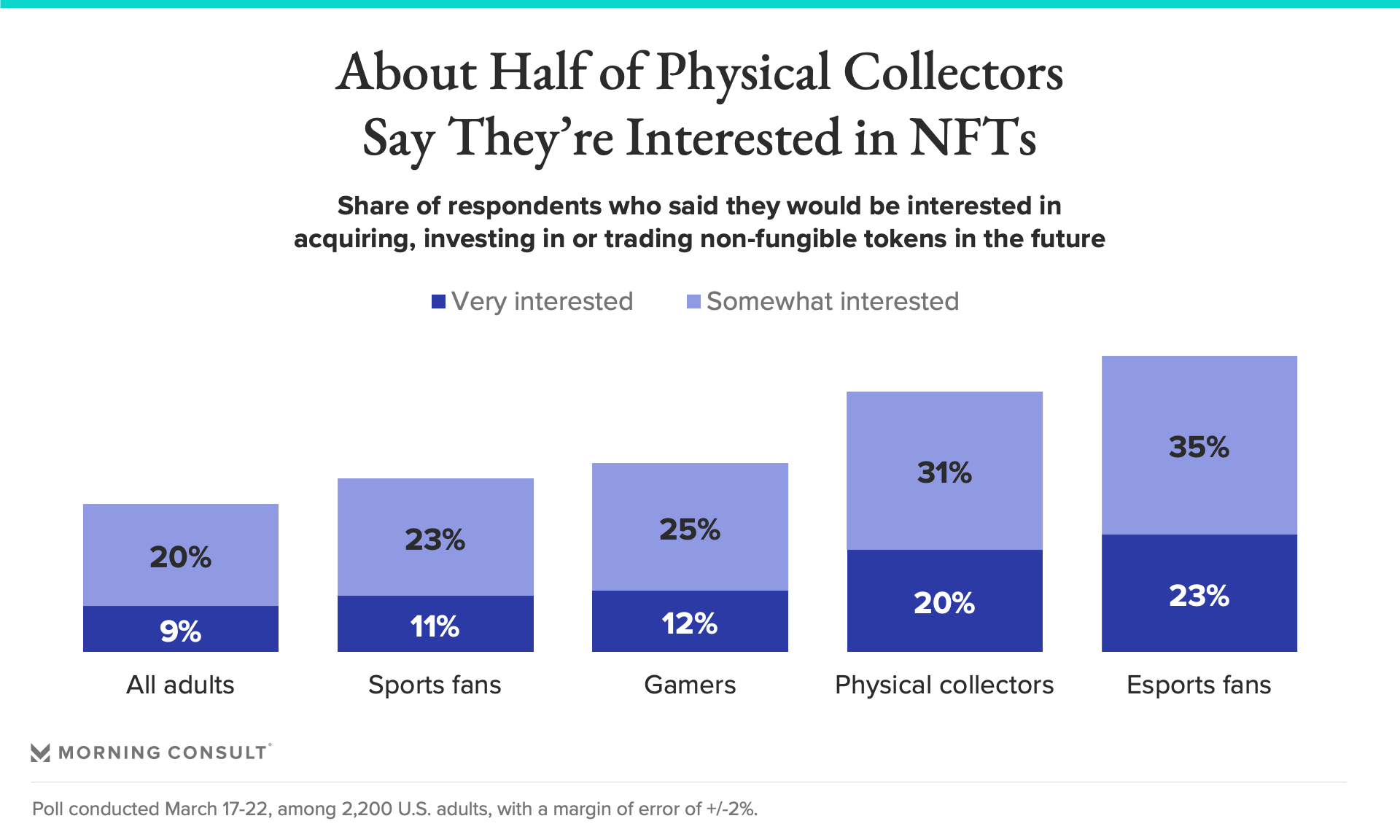 There is already significant crossover between physical and digital collectors, with 1 in 4 self-identified collectors of tangible items indicating they also engage with NFTs. About half of physical collectors said they would be either “very” or “somewhat” interested in acquiring NFTs in the future. Meanwhile, 86 percent of individuals already collecting NFTs said they are also physical hobbyists.