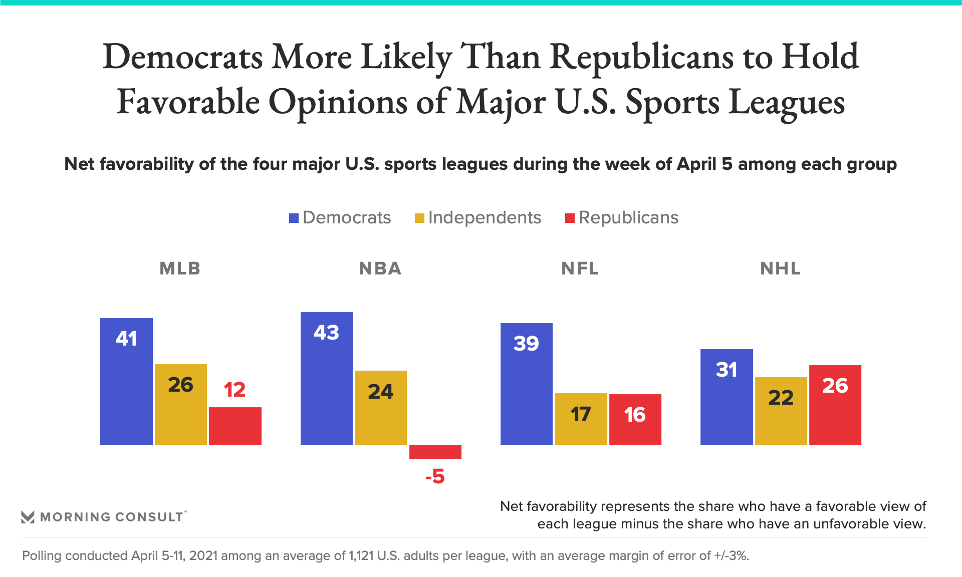 MLB is the latest sports property to fall out of favor with Republicans following its decision to pull its upcoming All-Star Game and draft out of Atlanta in response to Georgia’s new voting law that changes how elections are administered. As a result, Republicans now have a less favorable view than Democrats of all four major U.S. sports leagues.