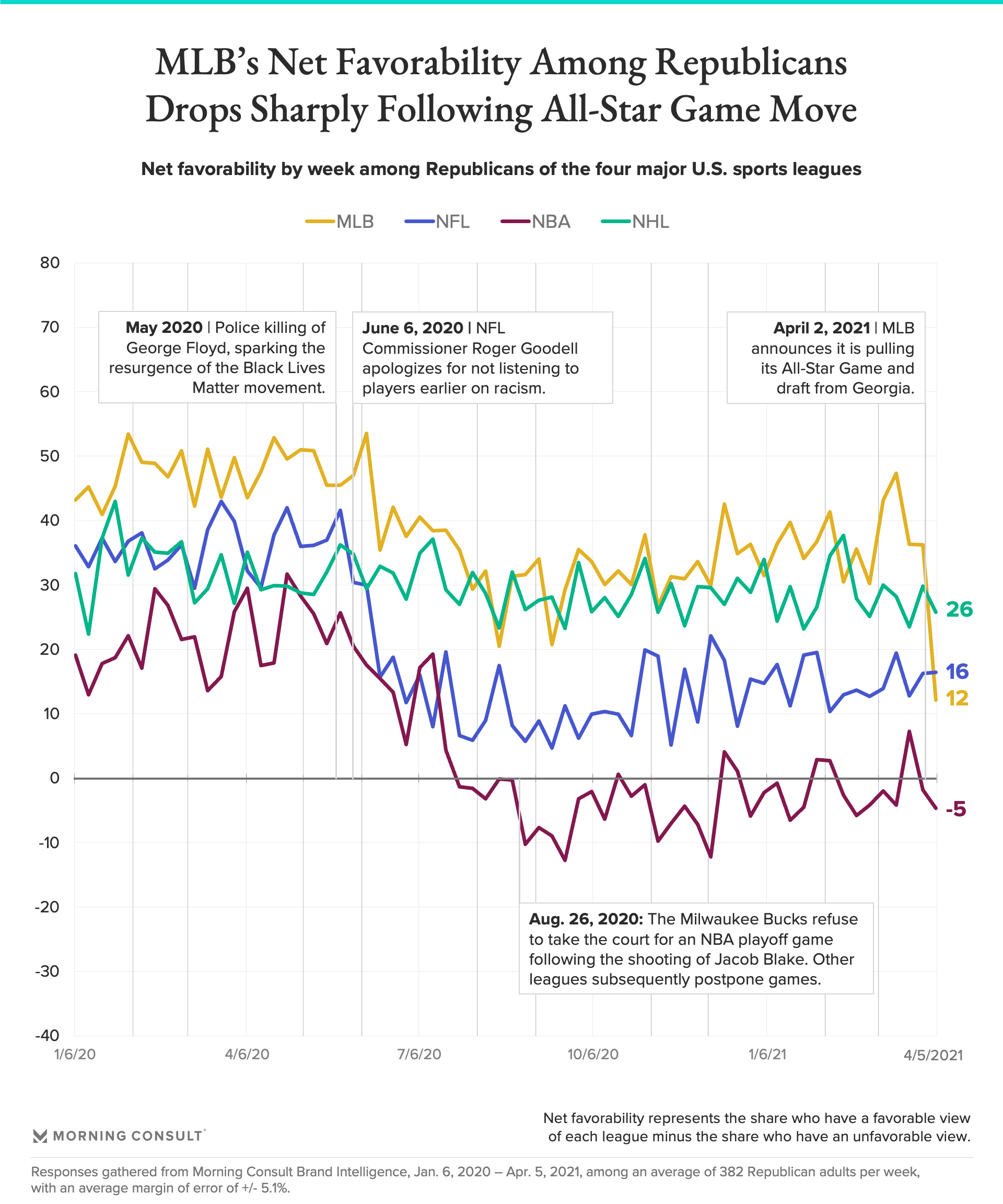 New data from Morning Consult Brand Intelligence, which tracks consumer attitudes, indicates that MLB’s net favorability rating among Republicans plummeted from 47 percentage points in mid-March to just 12 points at the end of last week, following the league’s decision to relocate its events. Net favorability is calculated by taking the difference between the share of respondents with a positive opinion of the league and the share with a negative opinion.