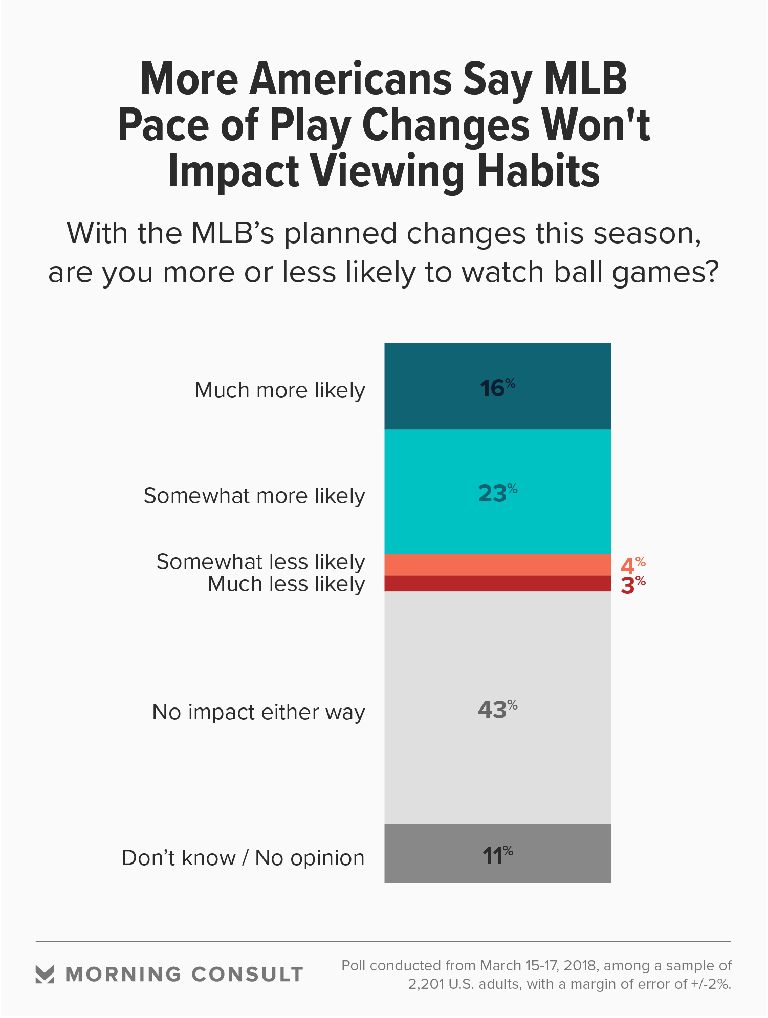 Polling of the new rule changes found that a 43 percent plurality said the effort had no impact on whether they would watch baseball games during the upcoming season. Thirty-nine percent said the changes made them somewhat more likely or much more likely to watch a baseball game, while 7 percent said it made them somewhat less likely or much less likely to tune in.