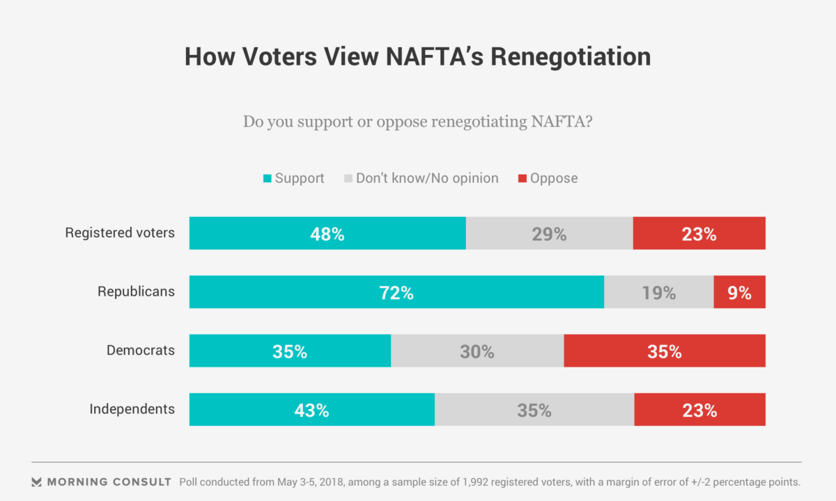 Overall, a 48 percent plurality of registered voters in a Morning Consult/Politico poll conducted May 3-5 said they back renegotiating NAFTA, compared to 23 percent who said they’re opposed and 29 percent who did not know or didn’t have an opinion. Broken down by party, 72 percent of GOP voters said they strongly or somewhat support the renegotiation efforts, with 35 percent of Democrats saying the same.