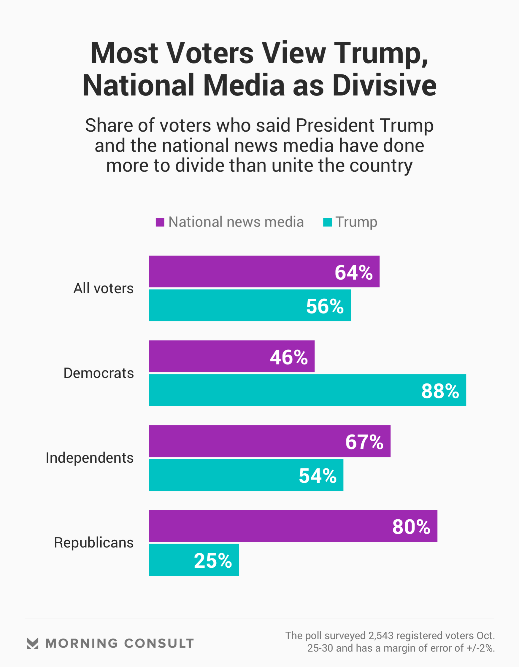 In the new Morning Consult/Politico poll, 64 percent of registered voters said the press has done more to divide the country than unite it since Trump took office, compared with 56 percent who said the same was true of the president. The poll of 2,543 voters was conducted Oct. 25-30, after news first broke of mail bomb suspect Cesar Sayoc’s attempted acts of politically motivated violence and amid news of a shooting by suspect Robert Bowers at the Tree of Life Synagogue in Pittsburgh.