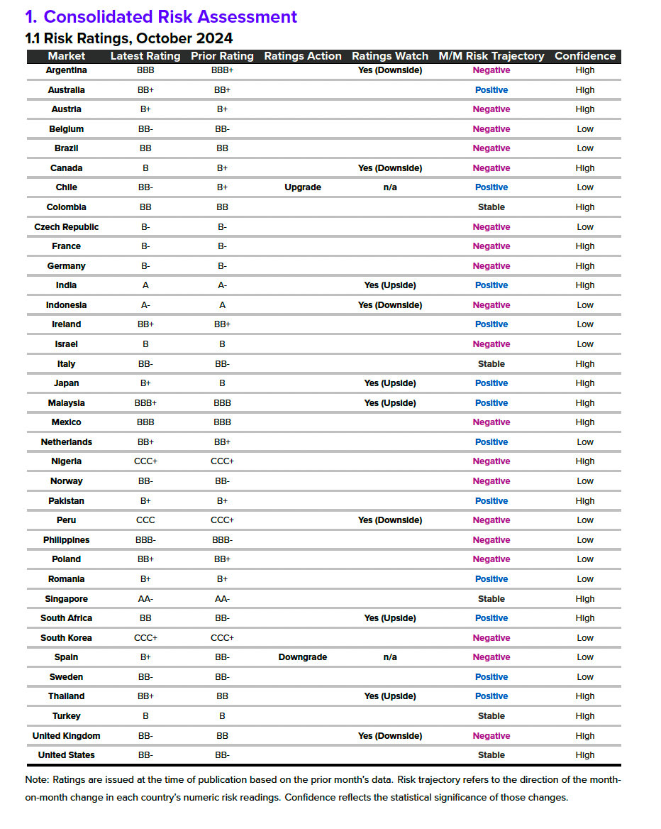 - Canada: Morning Consult has issued a downside ratings watch for Canada, with its rating moving from B+ to B. The watch comes amid two no-confidence motions targeting Prime Minister Justin Trudeau which bookended the close of the country’s latest assessment period, alongside recent Liberal Party by-election losses, which collectively bode poorly for the incumbent government.