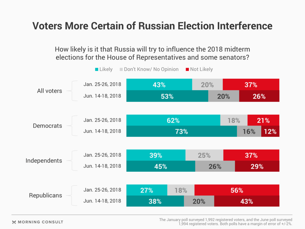 Previous Morning Consult/Politico polling, conducted in January, found that 43 percent of voters believed it was likely Russia would try to interfere in the 2018 midterm elections, while 37 percent said it wasn’t likely. Both polls have a margin of error of plus or minus 2 points.
