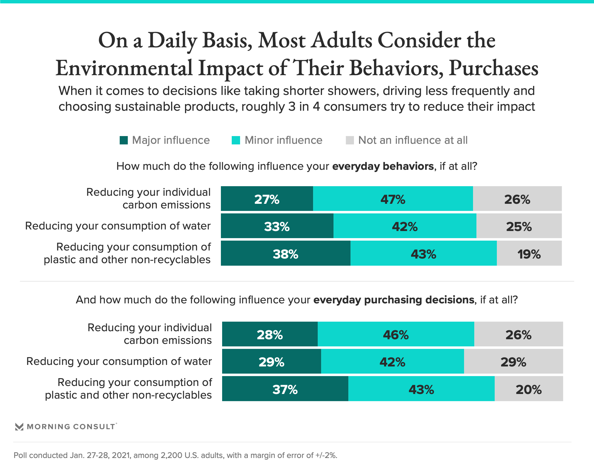 New data from a Jan. 27-28 poll found that roughly three-quarters of U.S. adults consider reducing their environmental impact as either a major or minor influence on both their personal behaviors (i.e., choosing to drive less, eating less meat) and their purchasing decisions (i.e., selecting products that are more sustainably produced) on a daily basis.