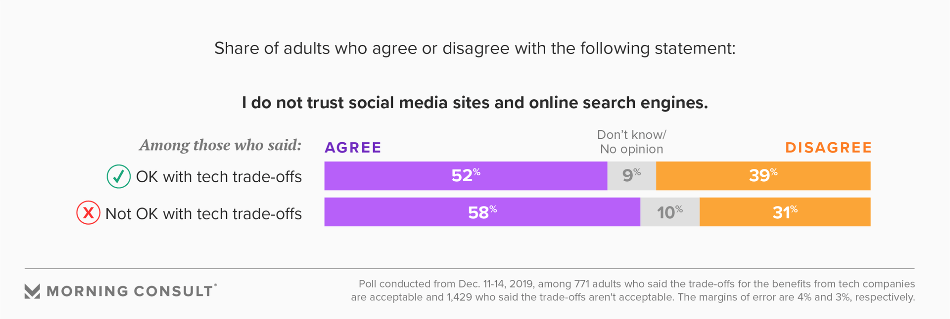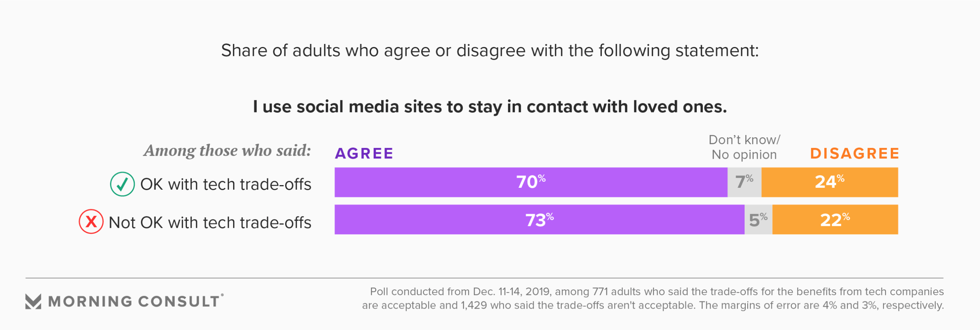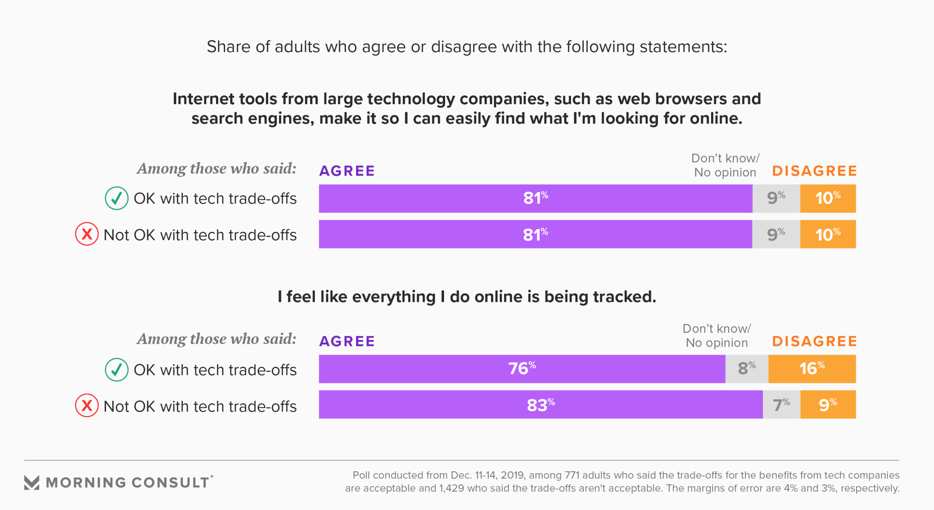 The overall survey has a margin of error of 2 percentage points. The margin of error was 4 points for the subsample of people who said the trade-offs were acceptable and 3 points for the ones who had the opposite opinion.