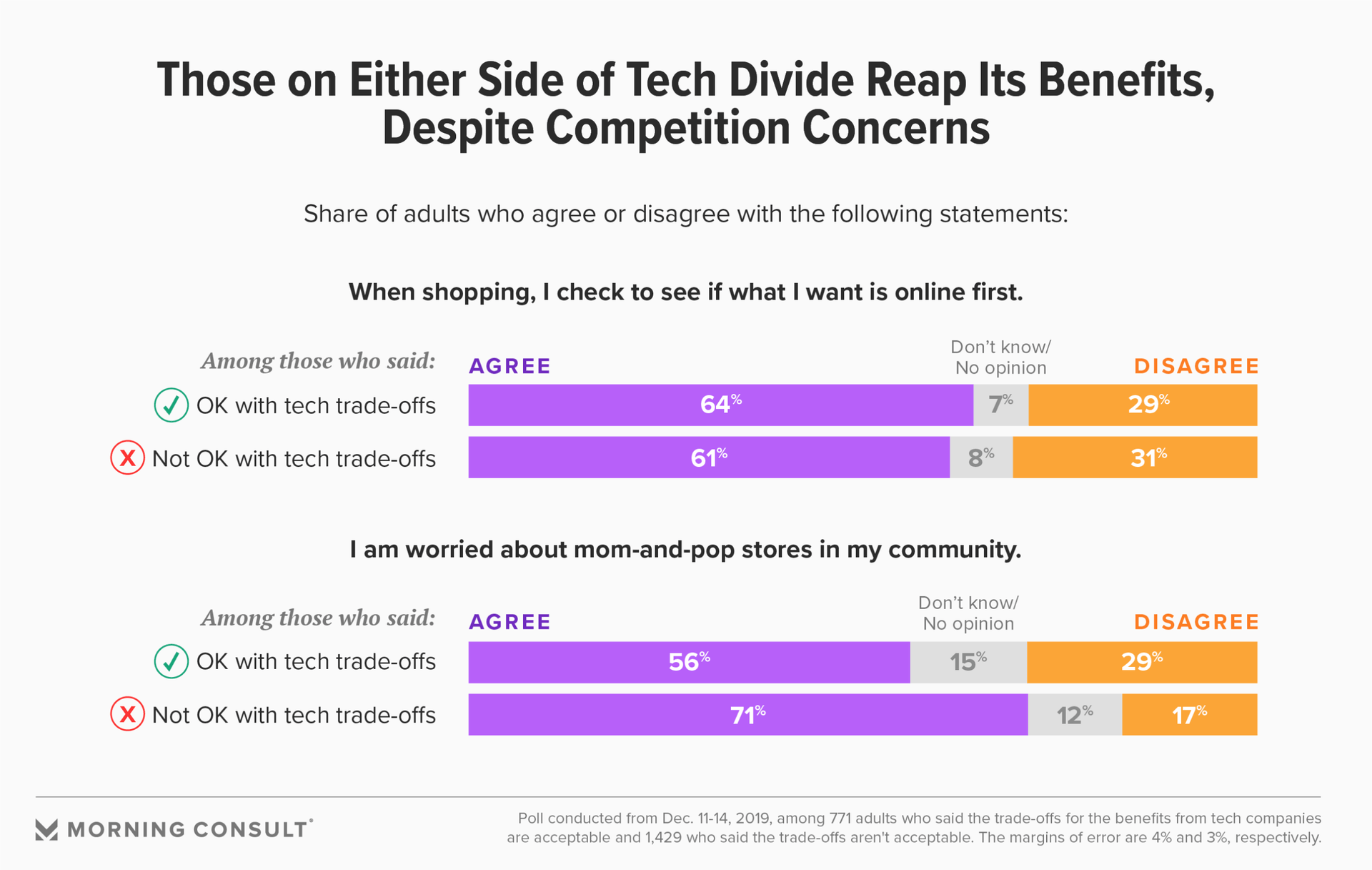 In the survey, conducted Dec. 11-14, 2,200 U.S. adults across the nation were first asked if they believed that the benefits that some large tech companies provide to customers constitute an acceptable trade-off for giving more power to the industry and taking business away from smaller competitors. Sixty-five percent, or 1,429 people, said it wasn’t an acceptable trade-off, while 35 percent, or 771 people, said it was.