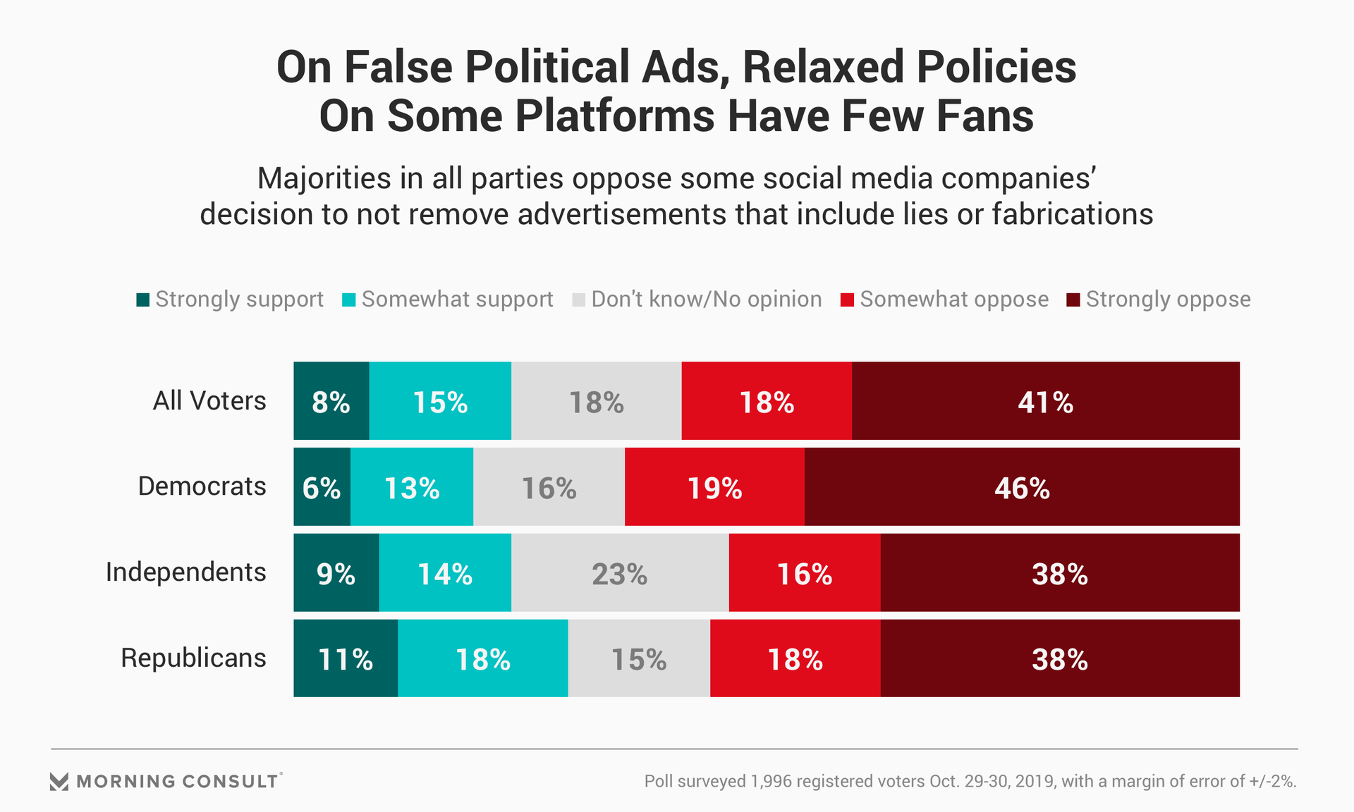 - 77% of voters said they’d support a law prohibiting ads with falsehoods on social media.
