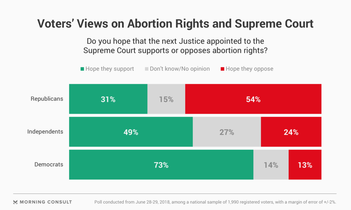 With questions about precedent and Roe v. Wade set to feature heavily in the debate around the upcoming confirmation process for Supreme Court Justice Anthony Kennedy’s successor, a new Morning Consult/Politico poll finds most voters want his replacement to support abortion rights.