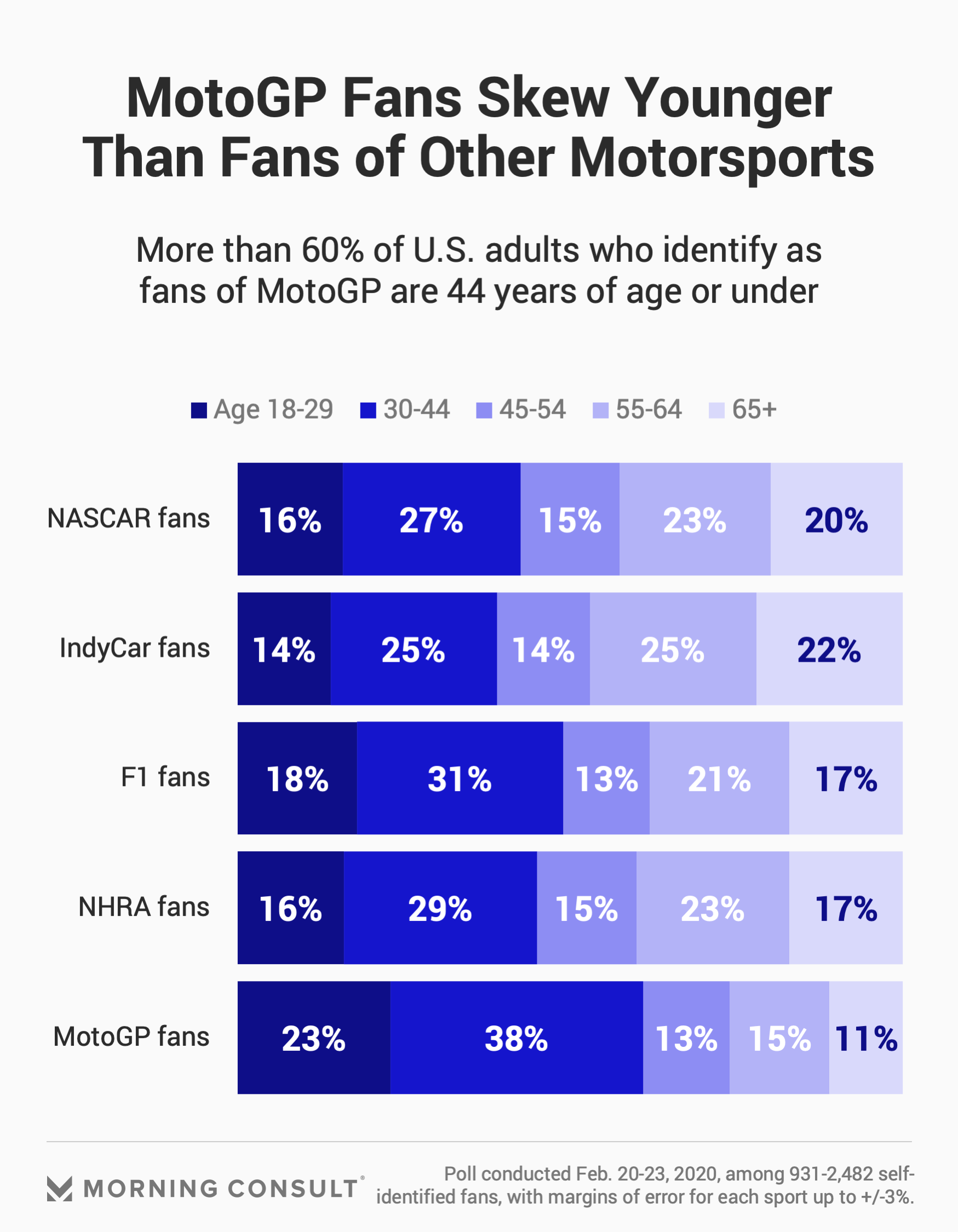 According to a survey of racing fans conducted in February, U.S. adults who identify as fans of MotoGP skew considerably younger than those who follow other top motorsports competitions in the U.S., such as NASCAR and IndyCar. Sixty-one percent of MotoGP fans are under the age of 45. By comparison, that age group makes up 49 percent of Formula 1 fans, 45 percent for the National Hot Rod Association, 43 percent for NASCAR and 39 percent for IndyCar.