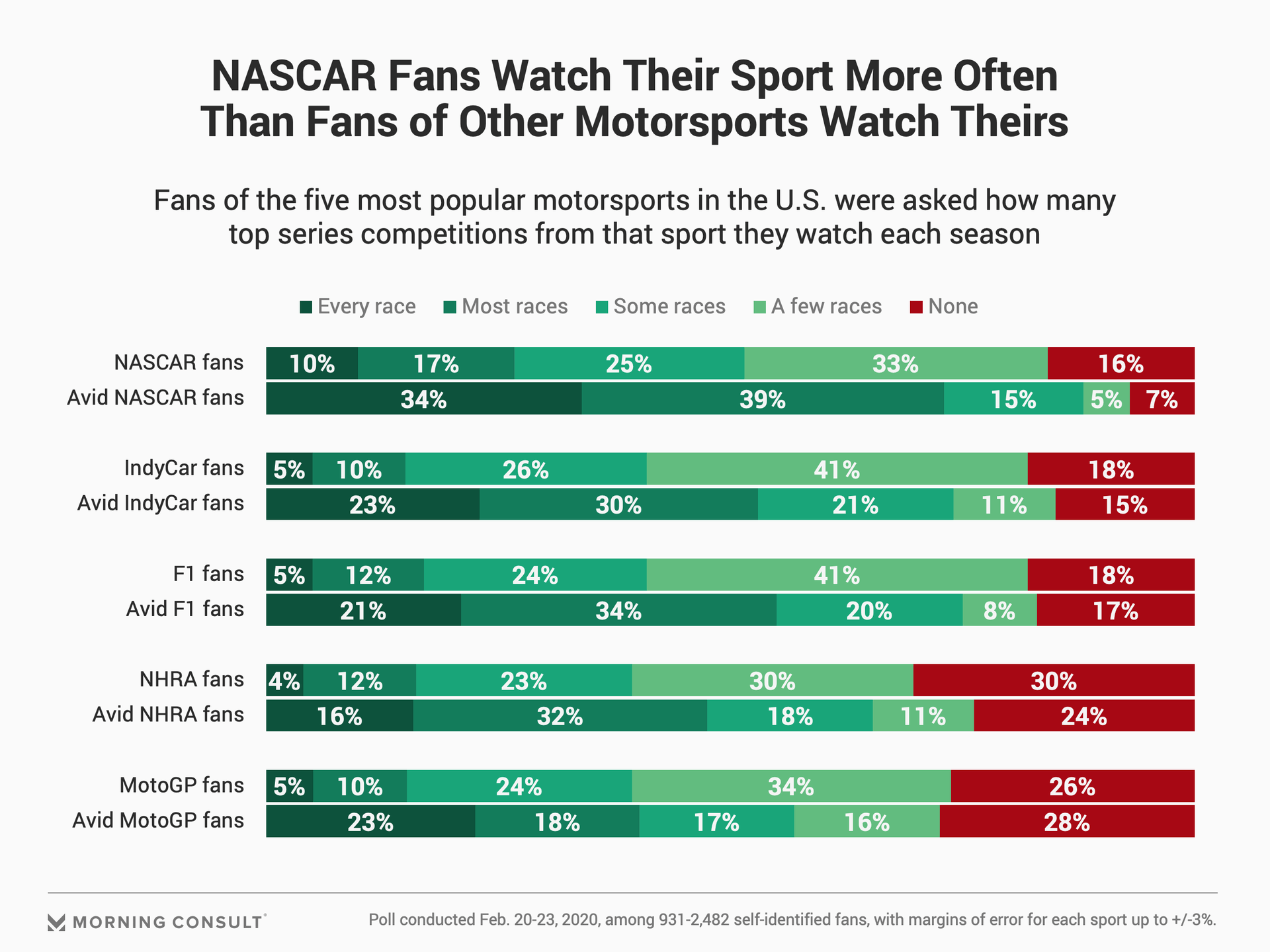 41% of avid MotoGP fans said they watch most races, compared to 73% among avid NASCAR fans.