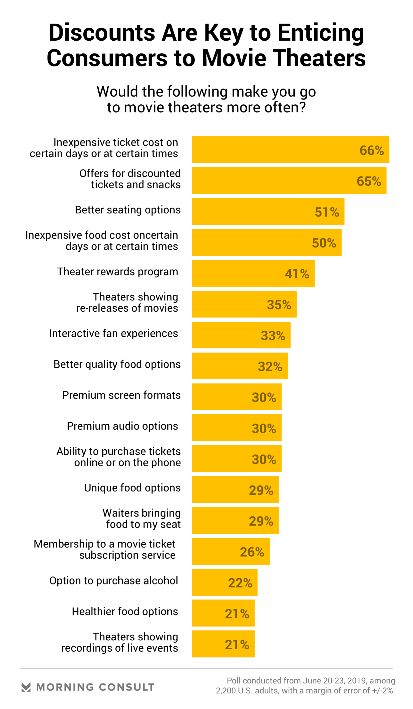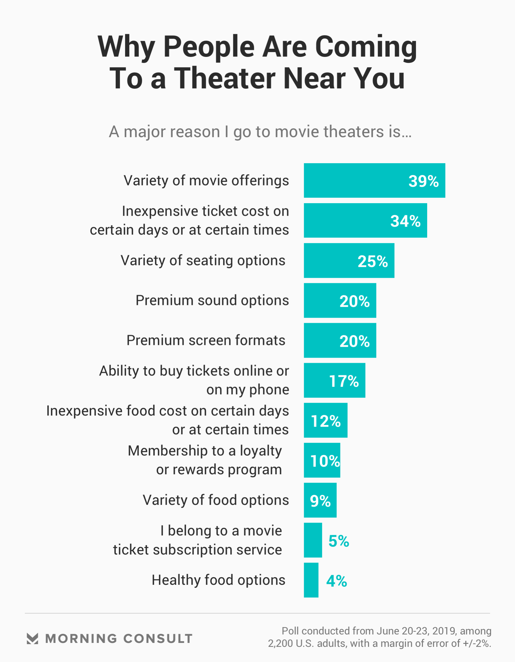 But even as MoviePass’ popularity waned, more and more theater chains began exploring their own subscription services. They are on the right track — a June 20-23 Morning Consult survey found that cost is the top reason people don’t go to the cinema — but in terms of the biggest draws, simple discounts for snacks and tickets far outranked the ticket subscription service model that so many chains have been experimenting with.