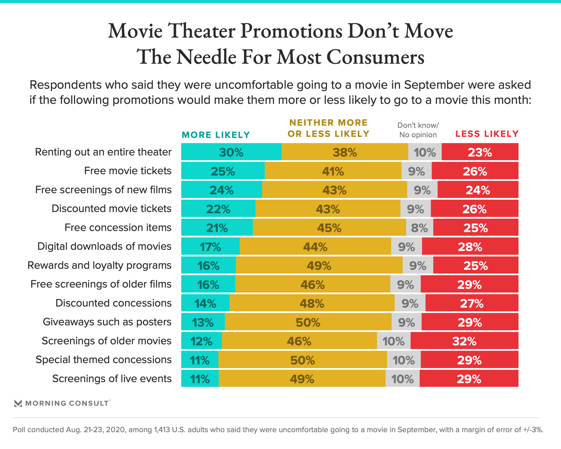 About one-quarter said offers for free movie tickets (25%) or free screenings of new movies (24%) would make them more likely to go.