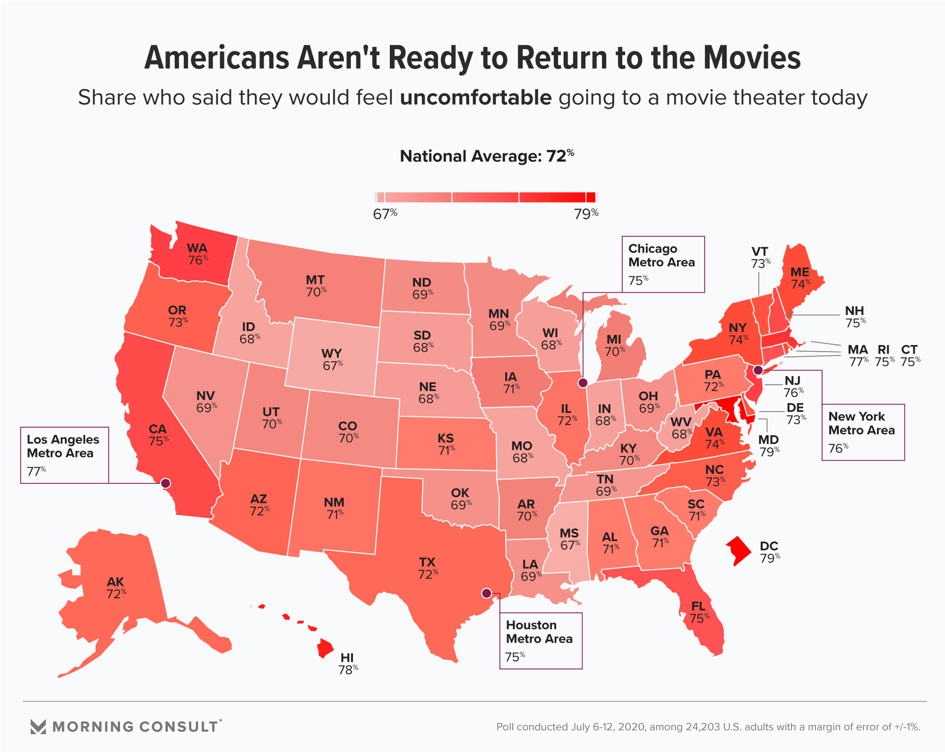 - 75% and 74% of California and New York residents, respectively, said they are not comfortable returning to a movie theater.
