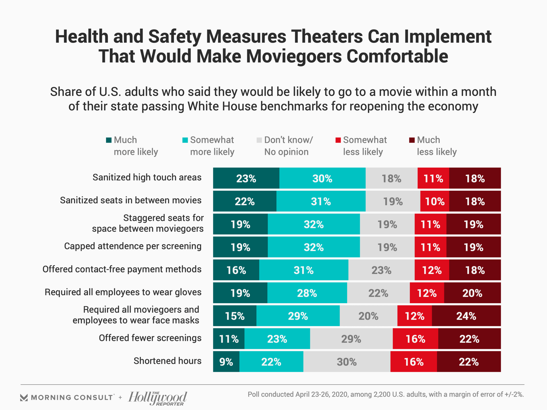 Notably, some of the public is less likely to frequent theaters under some new policies, such as requiring all moviegoers and employees to wear face masks: 36 percent said they’d be less likely to go to the movies in that case.