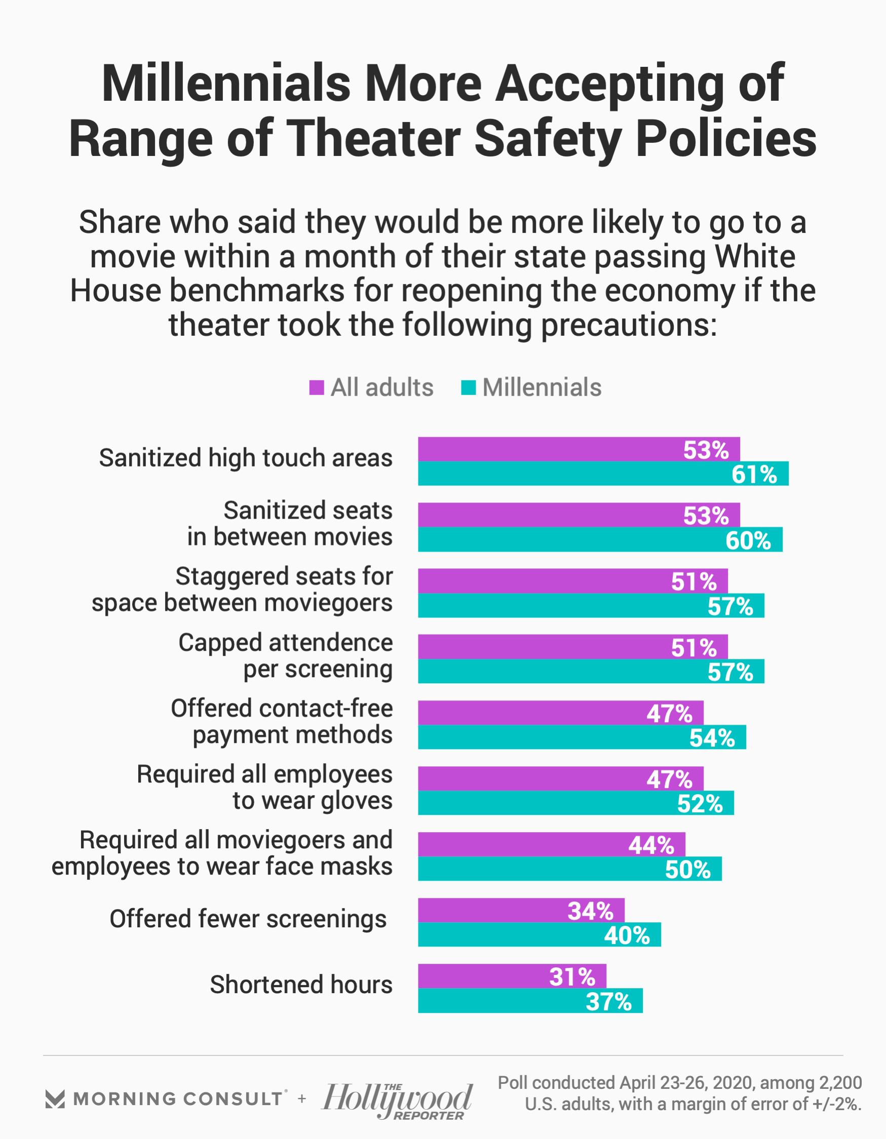 Just over half (53 percent) of respondents in an April 23-26 Morning Consult/The Hollywood Reporter survey said they would be more likely to see a movie if theaters sanitized every seat in between movies, in addition to sanitizing high-touch areas such as concession stands, within one month after their state passed benchmarks for reopening set by the White House.