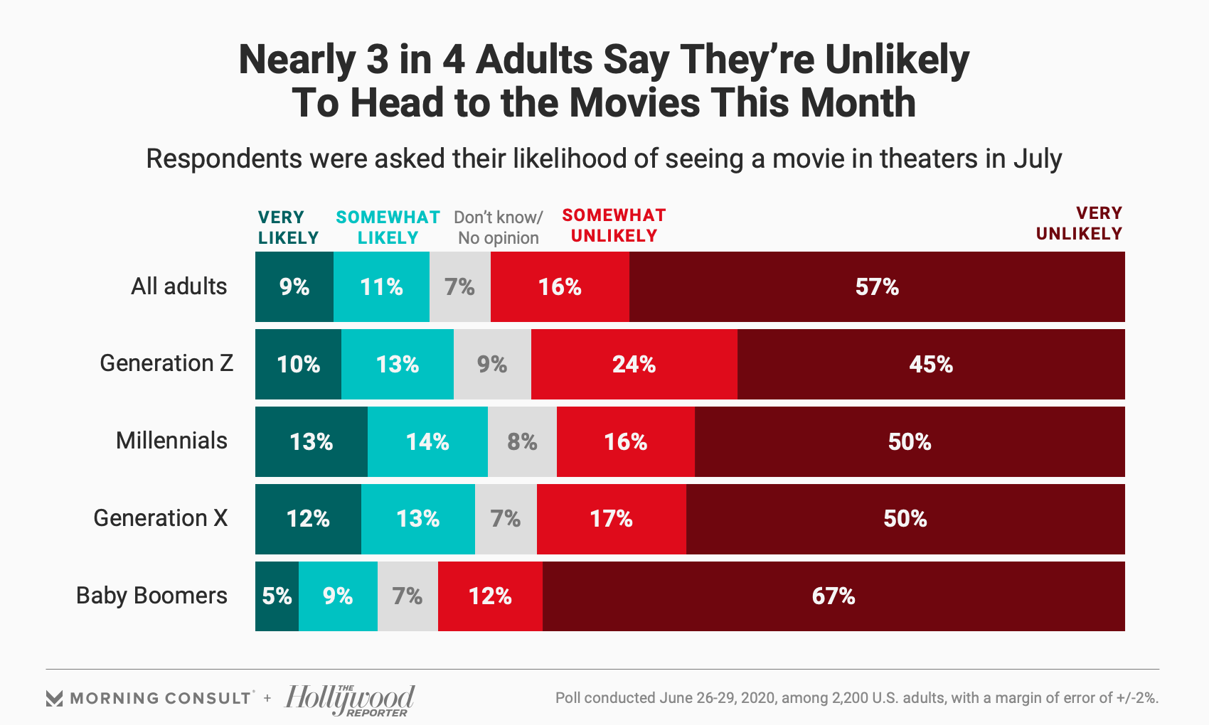 A June 26-29 Morning Consult/The Hollywood Reporter poll found that nearly 3 in 4 (73 percent) of the 2,200 U.S. adults surveyed said they are unlikely to return to cinemas in July, while one-fifth of respondents said they would likely check out a film this month.