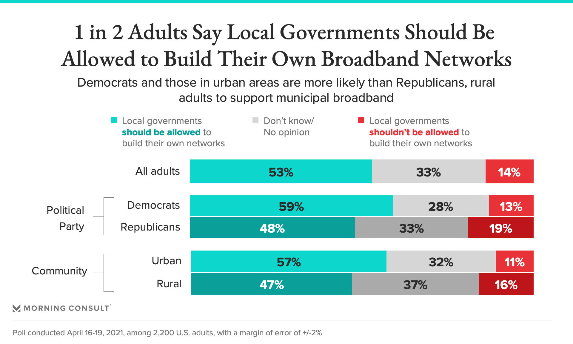 Just 14% of adults said local governments should not be allowed to consider municipal broadband options.