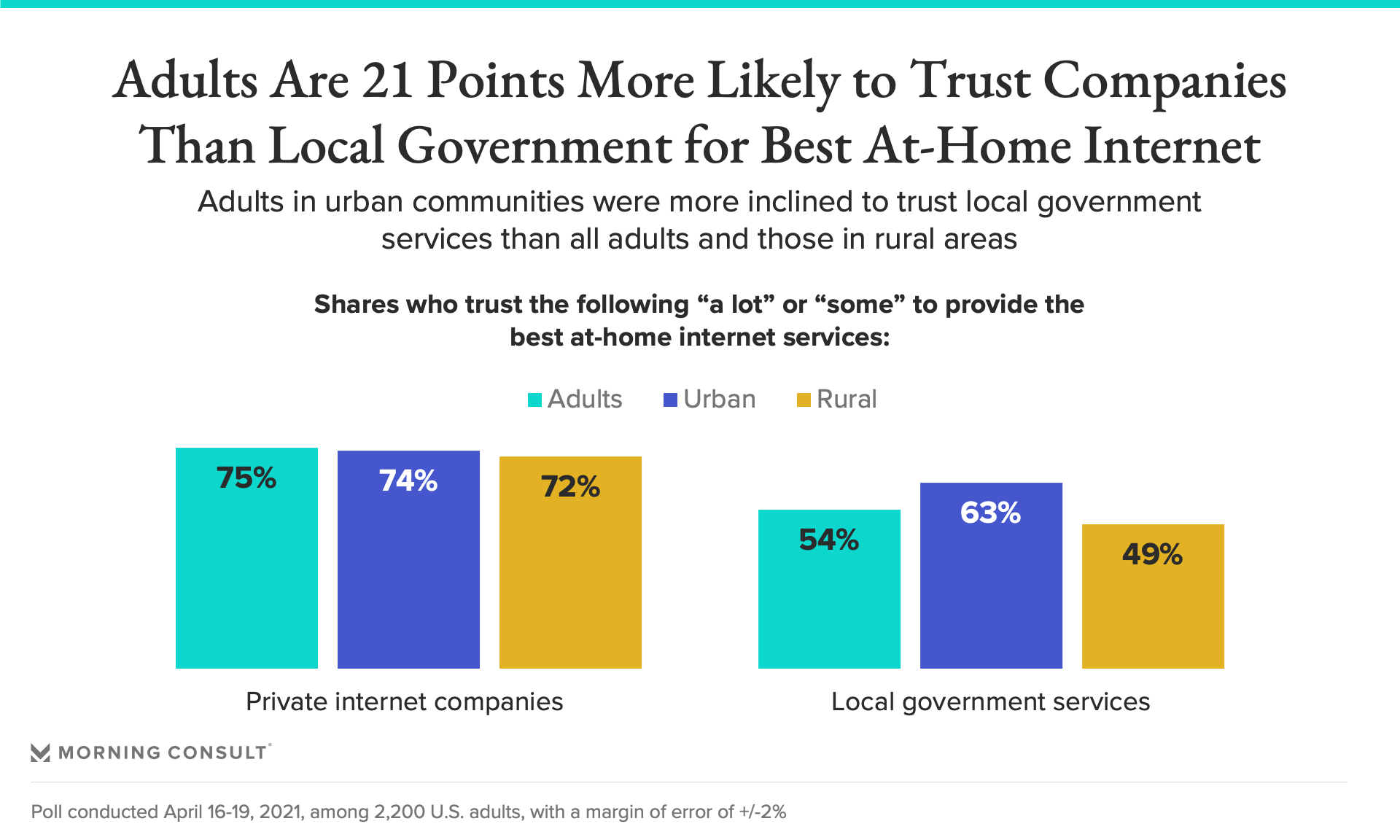 The White House, in its infrastructure proposal released earlier this month, has thrown its support behind allowing municipalities to explore such options. And a new Morning Consult poll suggests many adults agree with that stance: 53 percent of U.S. adults said local governments should be able to explore having their own internet services — but they tend to trust local governments less than private internet companies to carry out the job on their own.