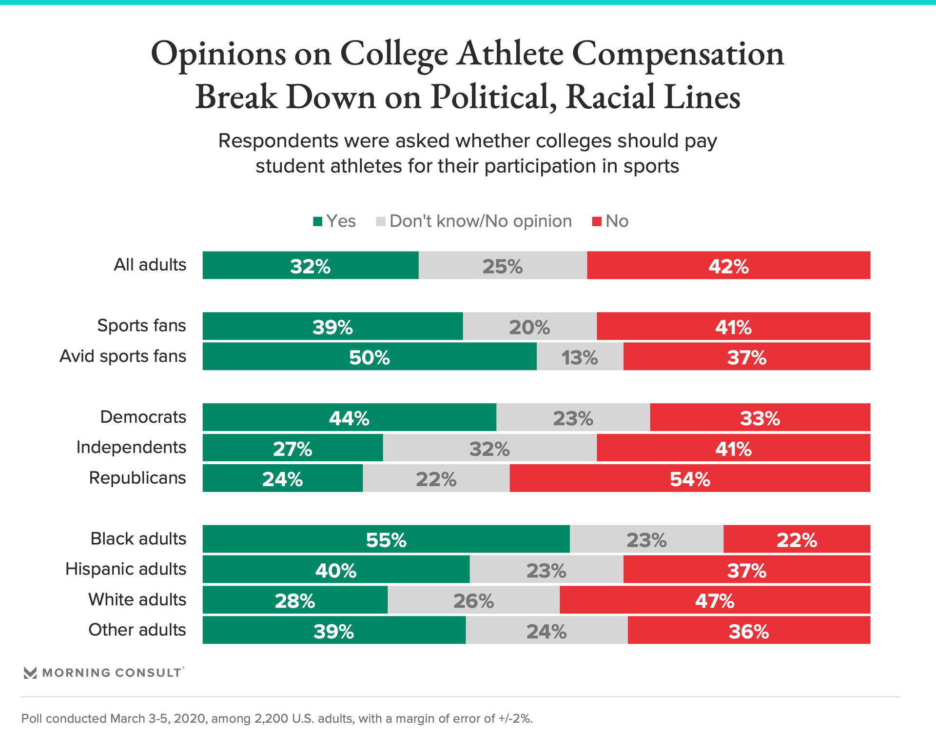 Among the American public, there are differences in opinion on issues of compensation for college athletes along political and racial lines. Asked in early March whether schools should pay student-athletes, 1 in 3 U.S. adults said yes, including 44 percent of Democrats, 27 percent of independents and 24 percent of Republicans. More than half of Black adults supported colleges paying athletes, compared to just 28 percent of whites.