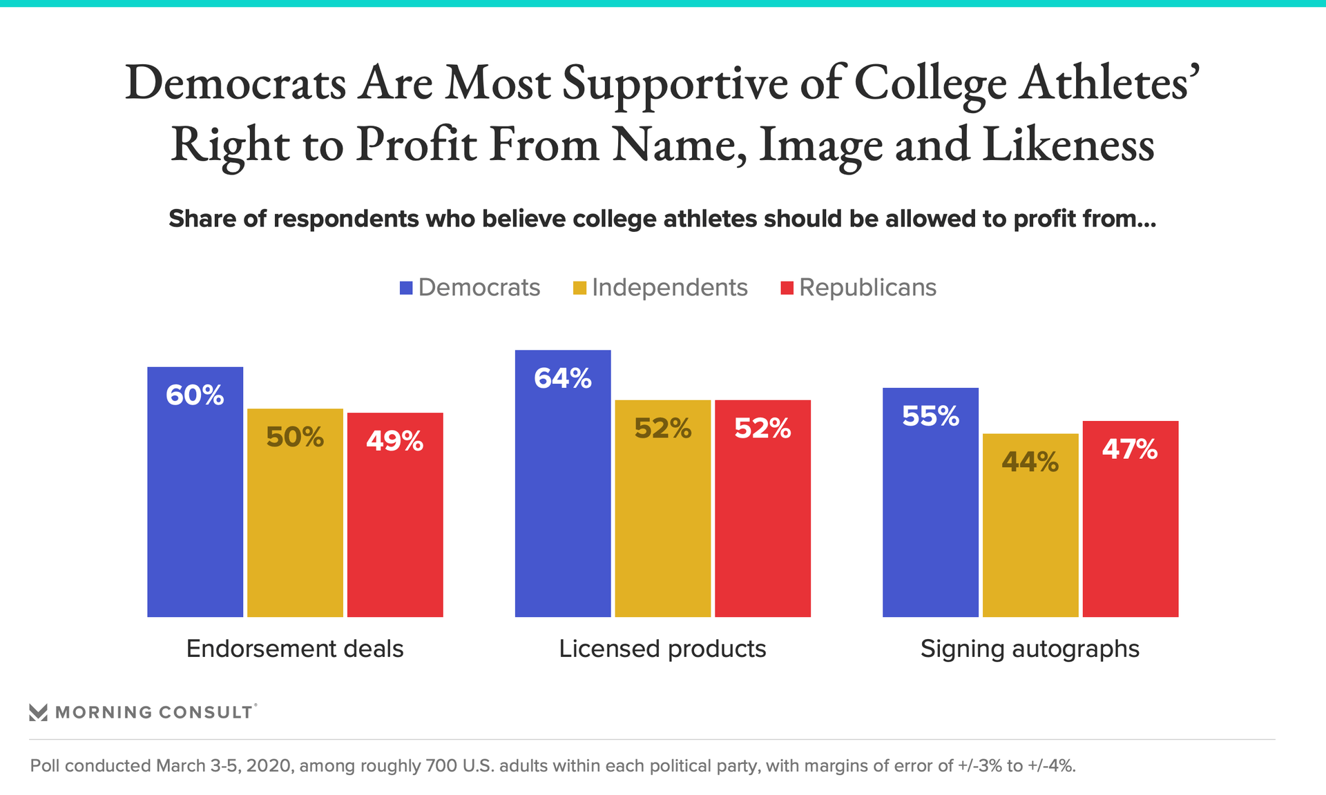 The survey also found that more than half of Americans supported college athletes being allowed to use their names, images and likenesses to profit from endorsement deals and licensed products, such as jerseys and video games, while 49 percent favored athletes being allowed to sell autographs. Democrats were more likely than Republicans and independents to favor all three types of name, image and likeness activity.