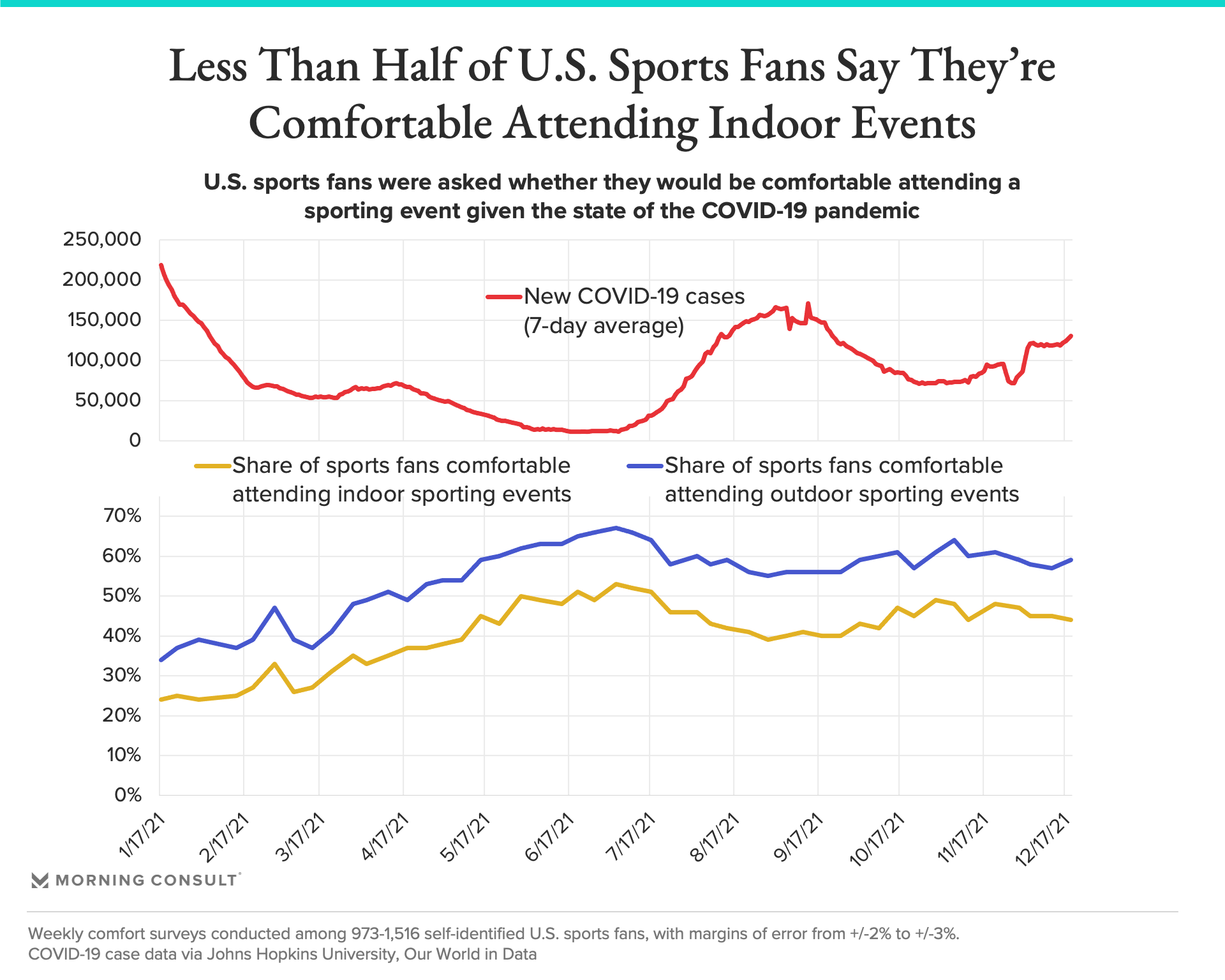 Since the start of October, a period that includes the early portions of both the NHL and NBA seasons, the share of sports fans comfortable attending an indoor event has fluctuated between 44 percent and 49 percent. The discovery of the omicron variant in late November has had little impact so far.