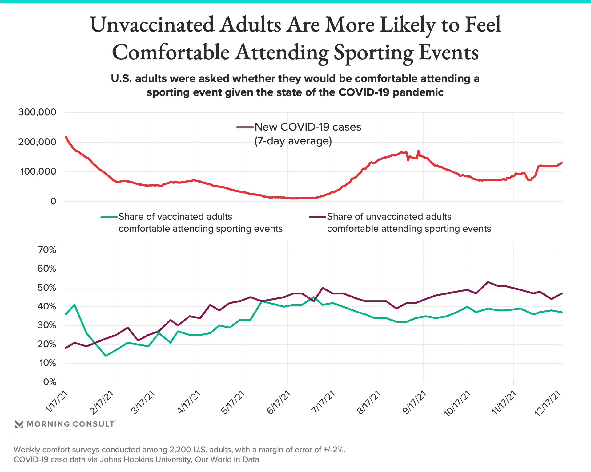 Teams are now faced with a Catch-22 in figuring out how to address fans’ reluctance. While establishing more stringent COVID-19 protocols might seem like the logical answer, Morning Consult data shows that unvaccinated adults are actually more comfortable attending events than vaccinated adults, meaning vaccination requirements might alienate a larger group of potential attendees in some markets.