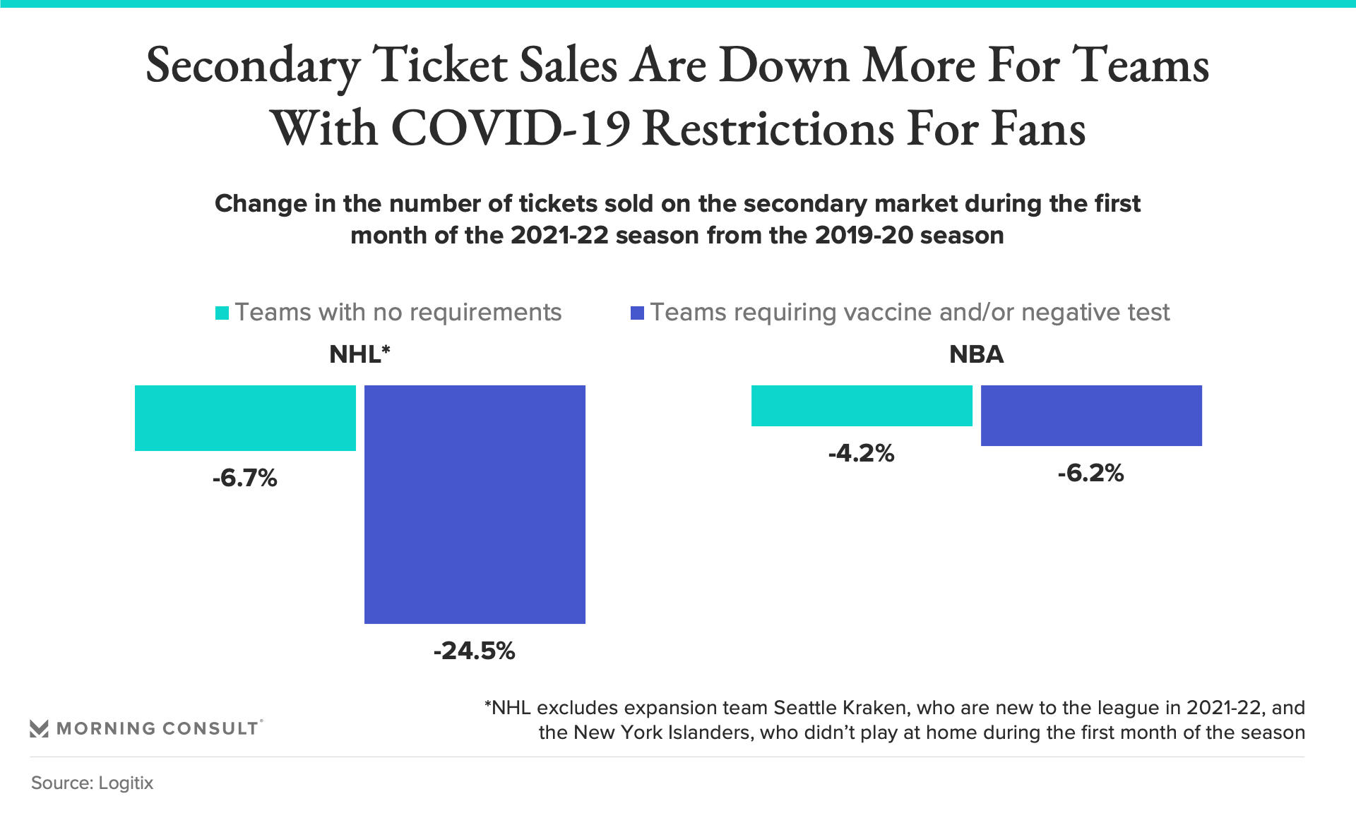 In fact, secondary market data from ticketing platform Logitix indicates that teams requiring proof of vaccination or a negative test for admittance experienced a worse average decline in tickets sold during the first month of the NHL and NBA seasons than teams without requirements. The difference was particularly stark in the NHL, which has seven teams based in Canada, generally a more coronavirus-cautious country with tighter restrictions than the United States.
