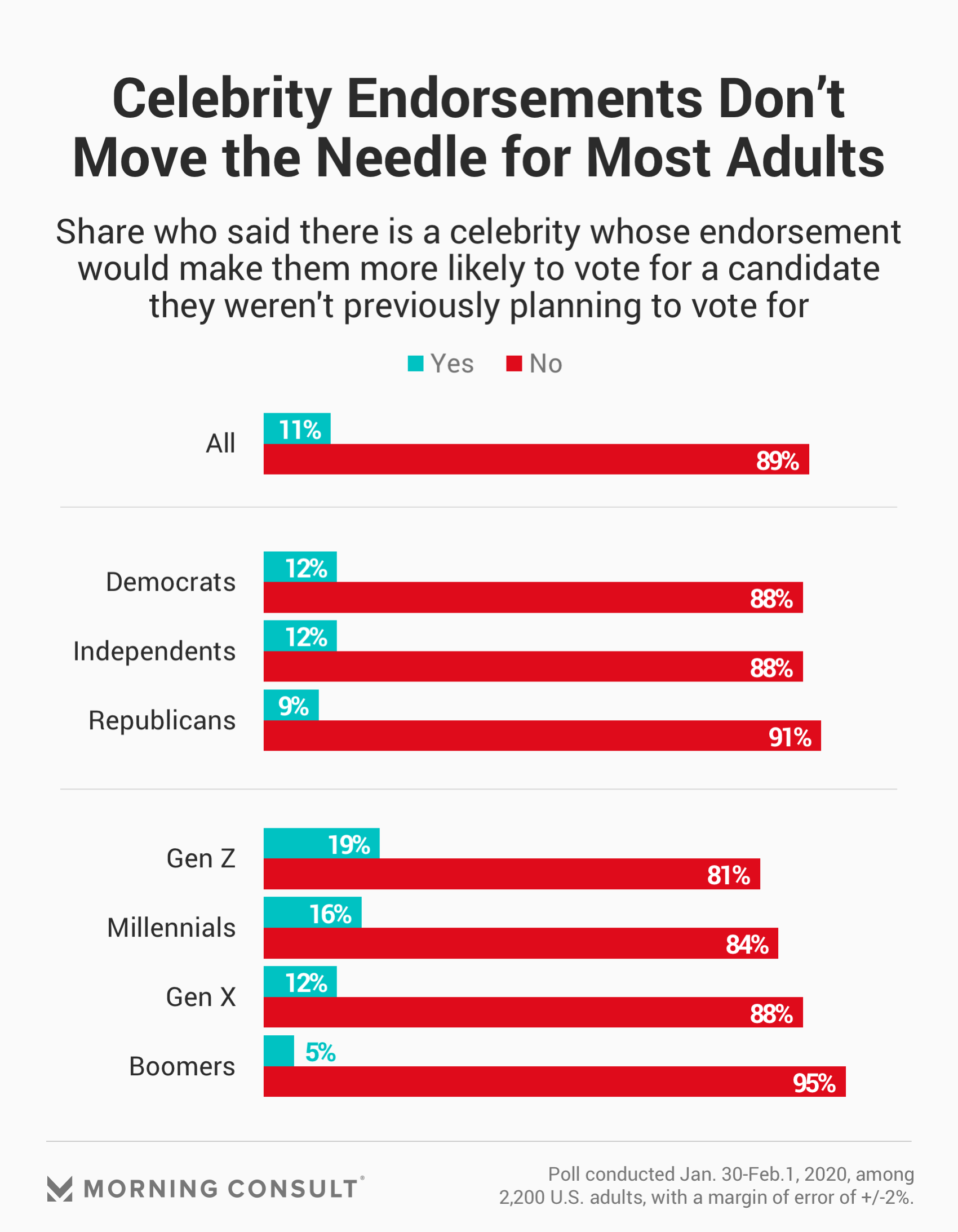 As the road to the 2020 election kicks into high gear and more celebrities voice their support for different candidates, a new round of Morning Consult/The Hollywood Reporter polling found that most of the public, including both Republicans and Democrats, is increasingly less likely to be fan of a celebrity who supported a candidate they did not like -- and nearly 9 in 10 Americans said there is no celebrity who could motivate them to vote for a different candidate.