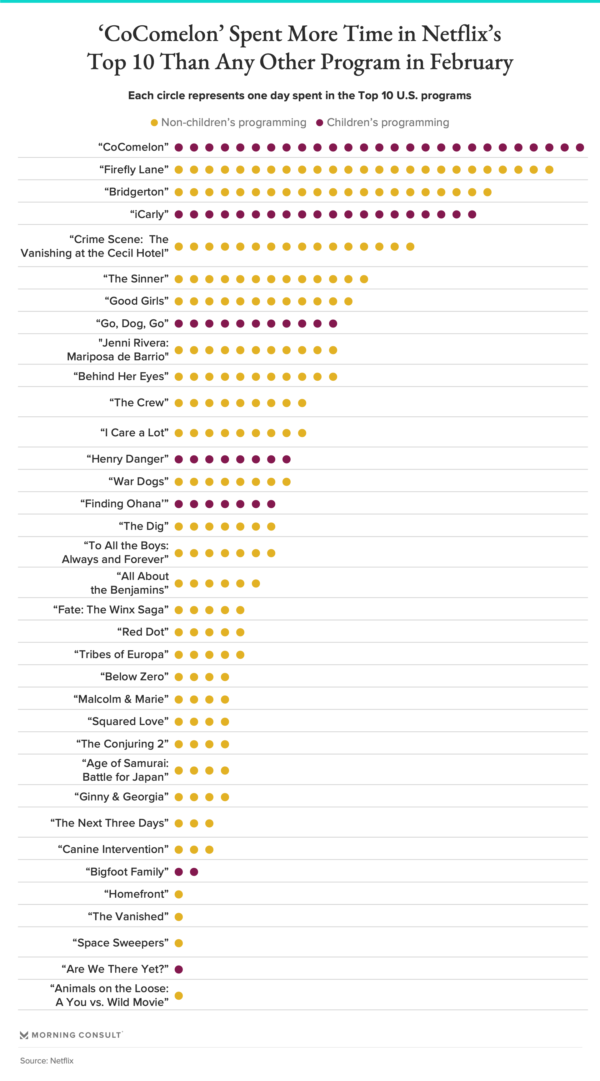 “CoComelon” was the most popular title, spending 27 days in Netflix’s Top 10 last month.