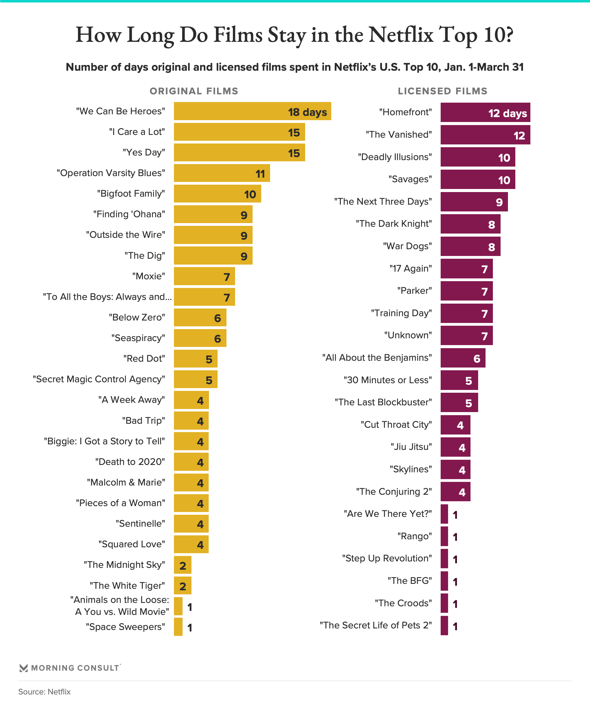 A Morning Consult analysis of the 50 films that appeared in the U.S. Top 10 rankings starting Jan. 1 through March 31 found that 26 were Netflix originals, while 24 titles were licensed content. Not only were there roughly an equal number of original and licensed titles, but the films spent roughly the same amount of time in the Top 10.