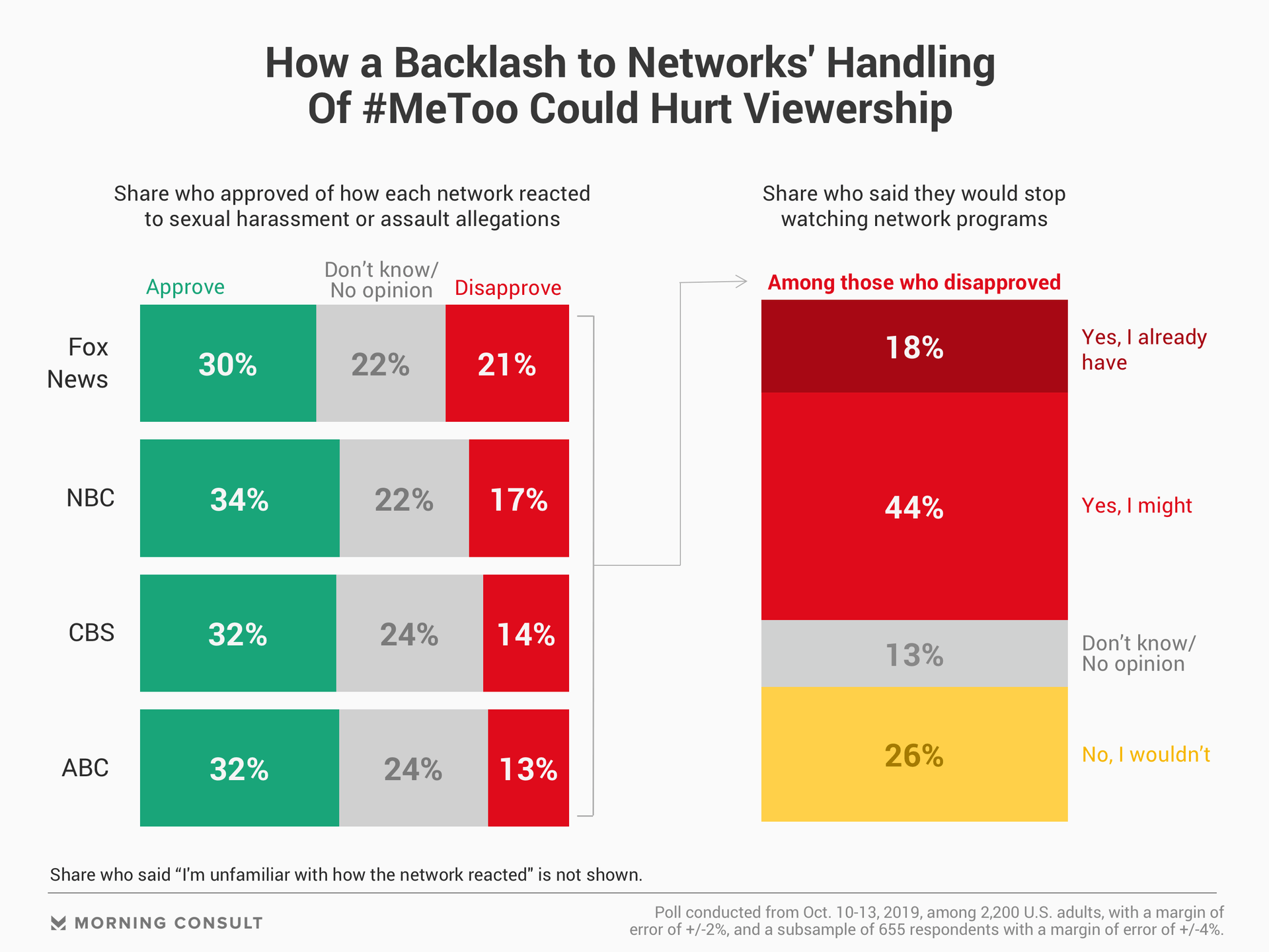 Among the 655 U.S. adults respondents who said they disapproved of how NBC, ABC, CBS or Fox handled allegations of sexual harassment or assault, 18 percent said they have already stopped watching programs on a network because they thought it had reacted inappropriately to the allegations. An additional 44 percent said they might stop watching network programming.