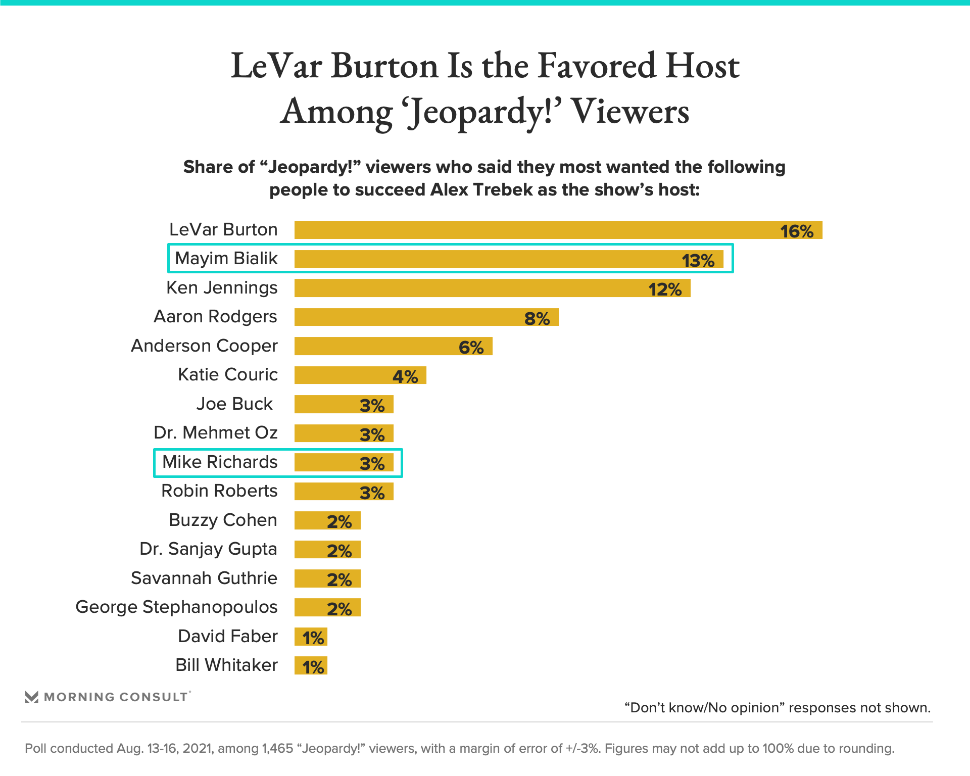 Actor and “Reading Rainbow” host, LeVar Burton, who garnered support even before he reported for duty as a guest host when more than 267,000 people signed a Change.org petition calling for him to succeed Trebek, was also the No. 1 choice in the Morning Consult survey, with 16 percent of “Jeopardy!” viewers saying he would have been their pick for host (download PDF file here).