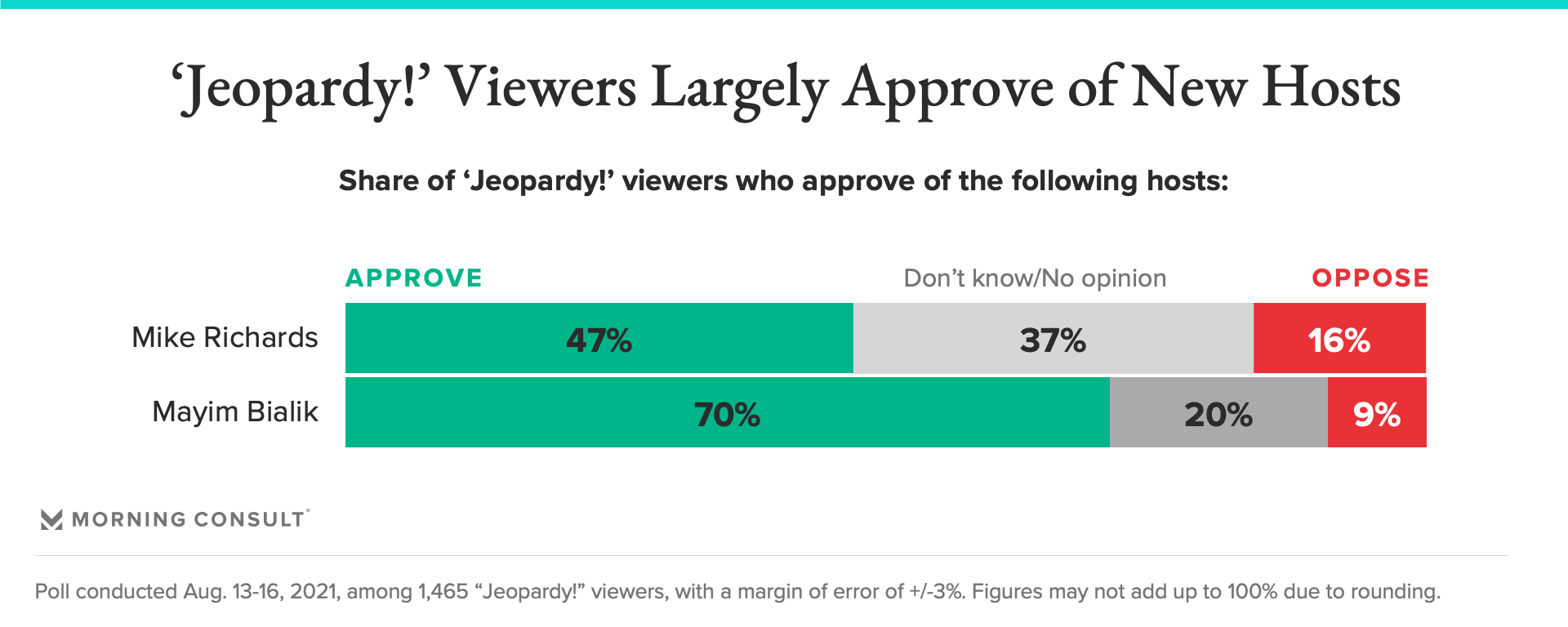 47% of “Jeopardy!” viewers said they approve of the selection of “Jeopardy!” executive producer Mike Richards as host, while 70% said the same of actress and neuroscientist Mayim Bialik.