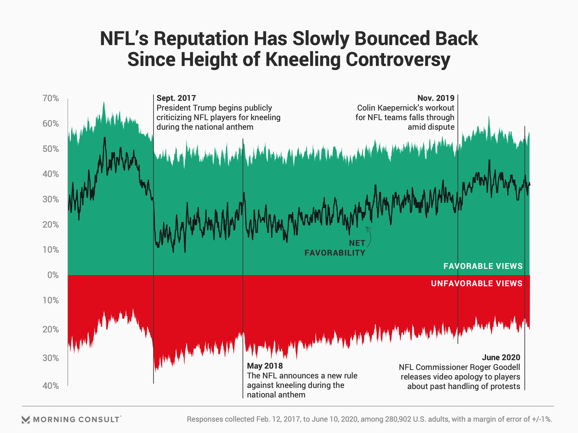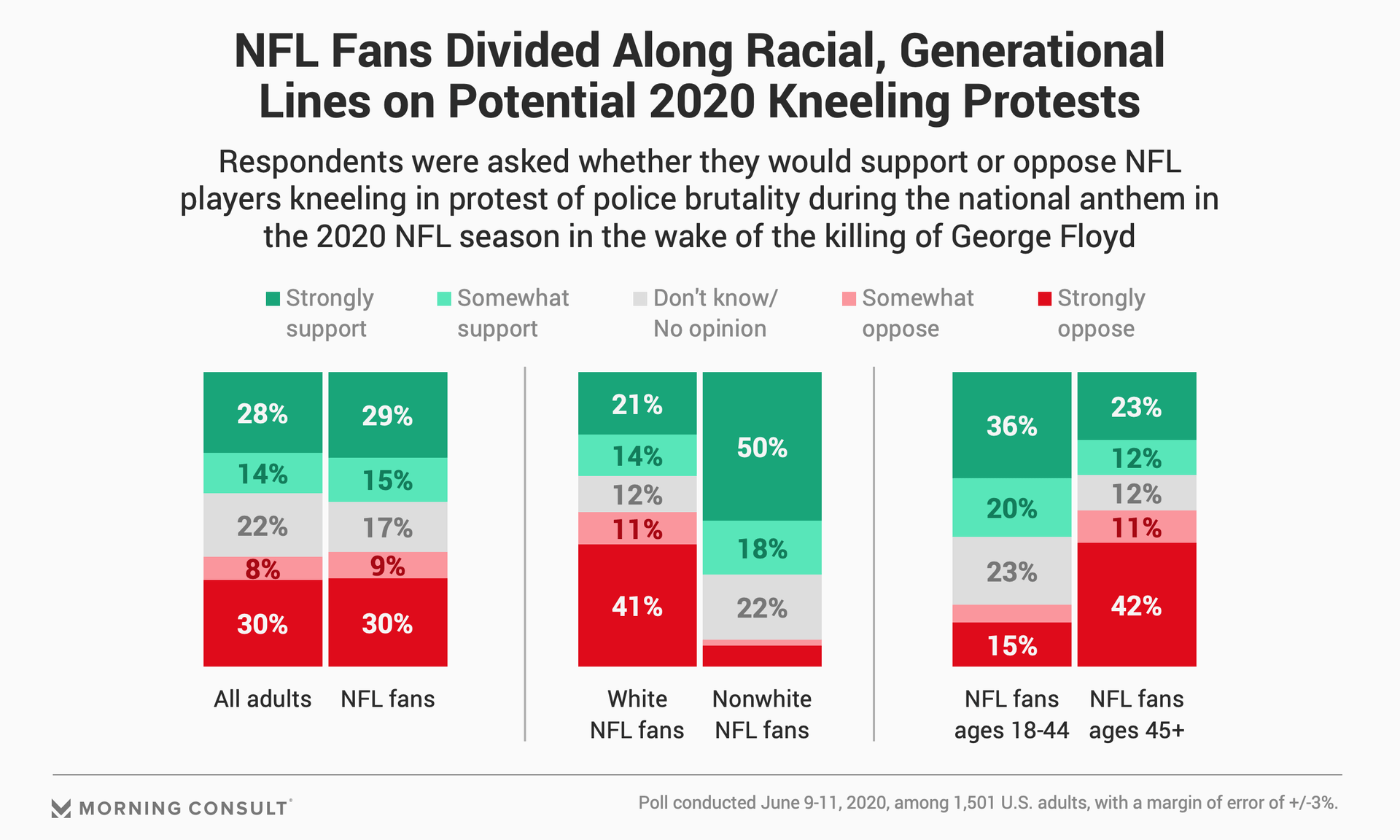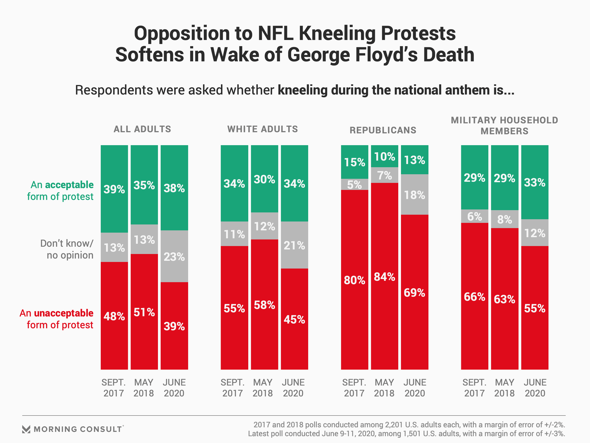 In the wake of the alleged murder of George Floyd and the subsequent surge of the Black Lives Matter movement, new Morning Consult polling shows that a significant number of Americans who previously opposed NFL players protesting police brutality by kneeling during the national anthem don’t know what to think anymore.