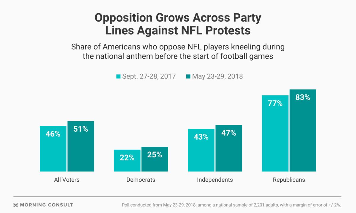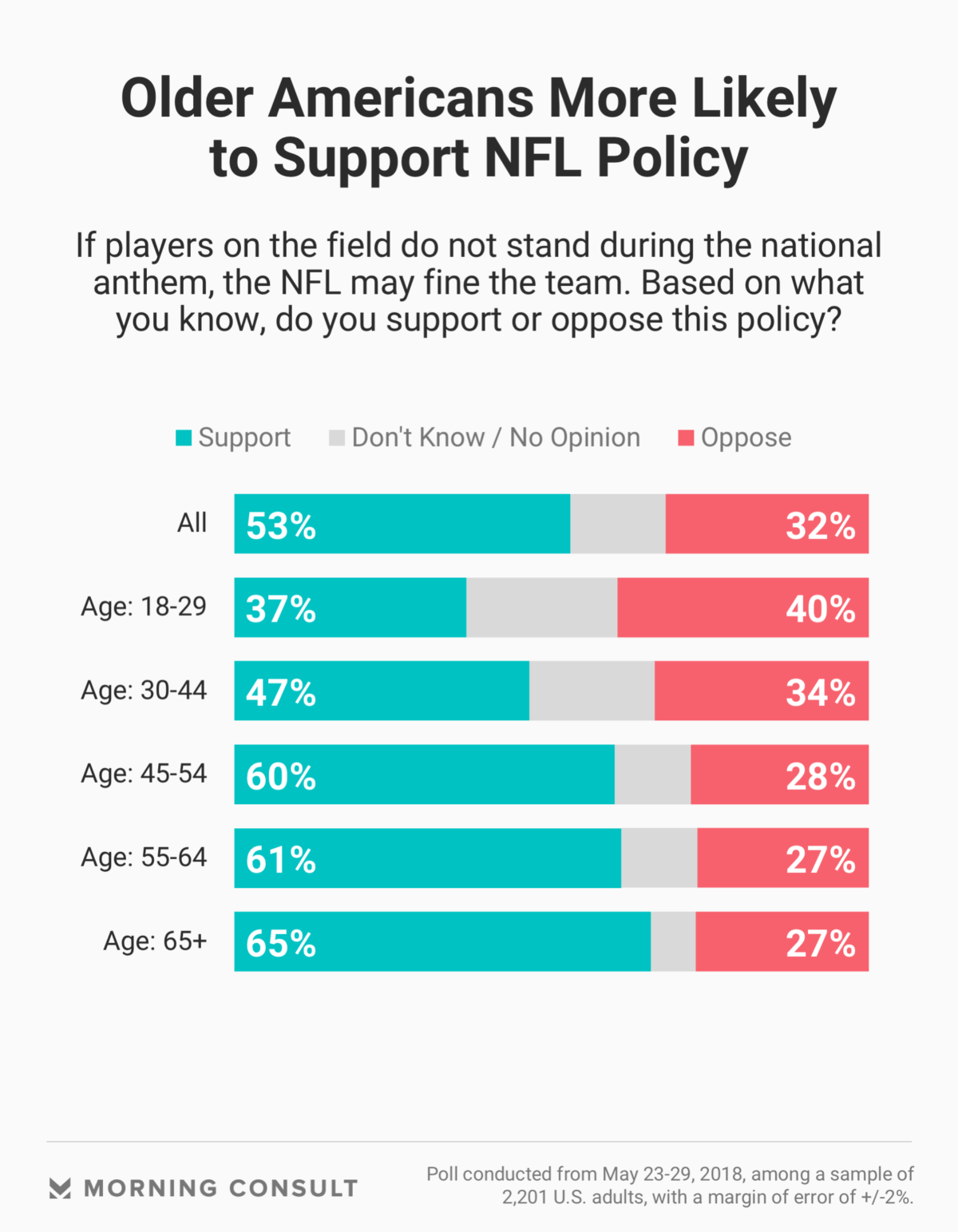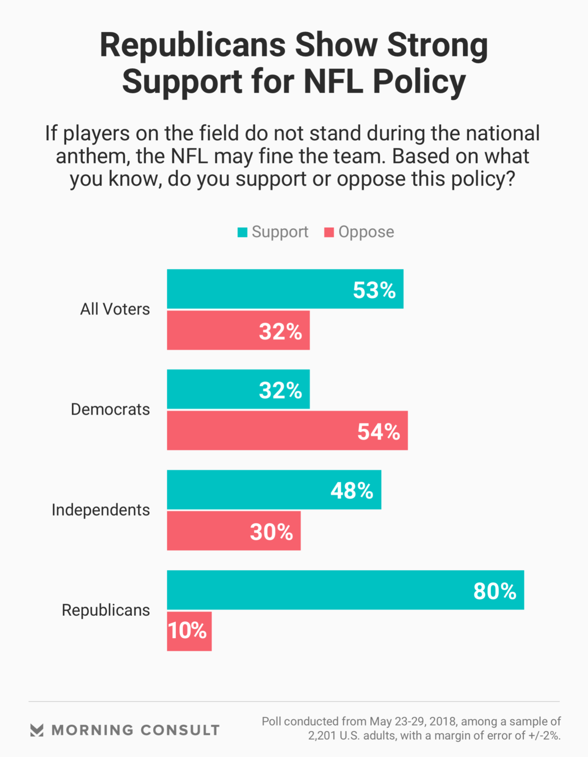 On May 23, the NFL announced a new policy requiring all players to either stand on the field during the national anthem or remain in the locker room, and anyone who kneels on the field risks incurring fines for his team. The policy has the backing of 53 percent of U.S. adults, according to a new Morning Consult/Politico poll, while 32 percent said they opposed the move, and 15 percent said they didn’t know or had no opinion. The poll surveyed 2,201 U.S. adults from May 23-29 and has a margin of error of 2 percentage points.