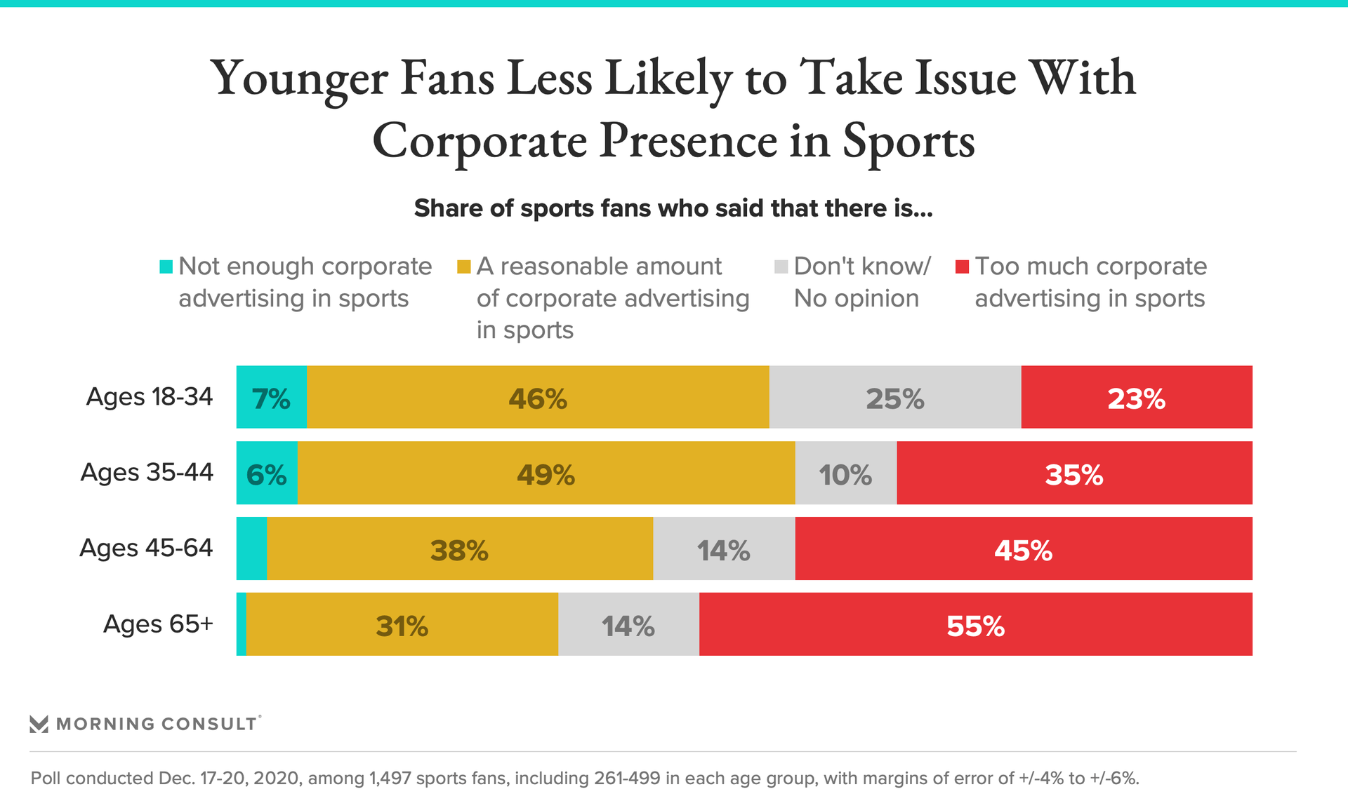 55% of sports fans ages 65 and older said there is too much corporate advertising in sports, compared to 23% of fans ages 18-34.